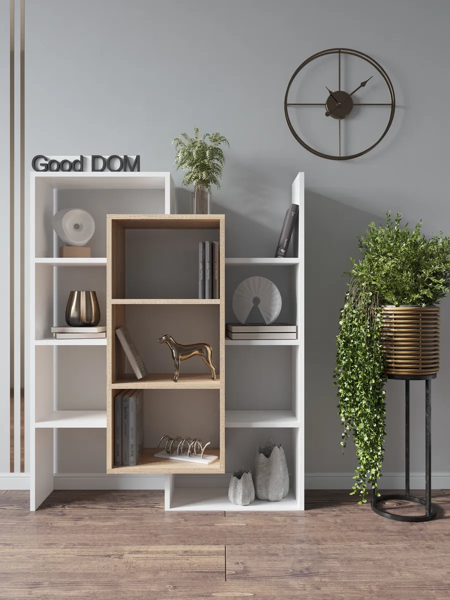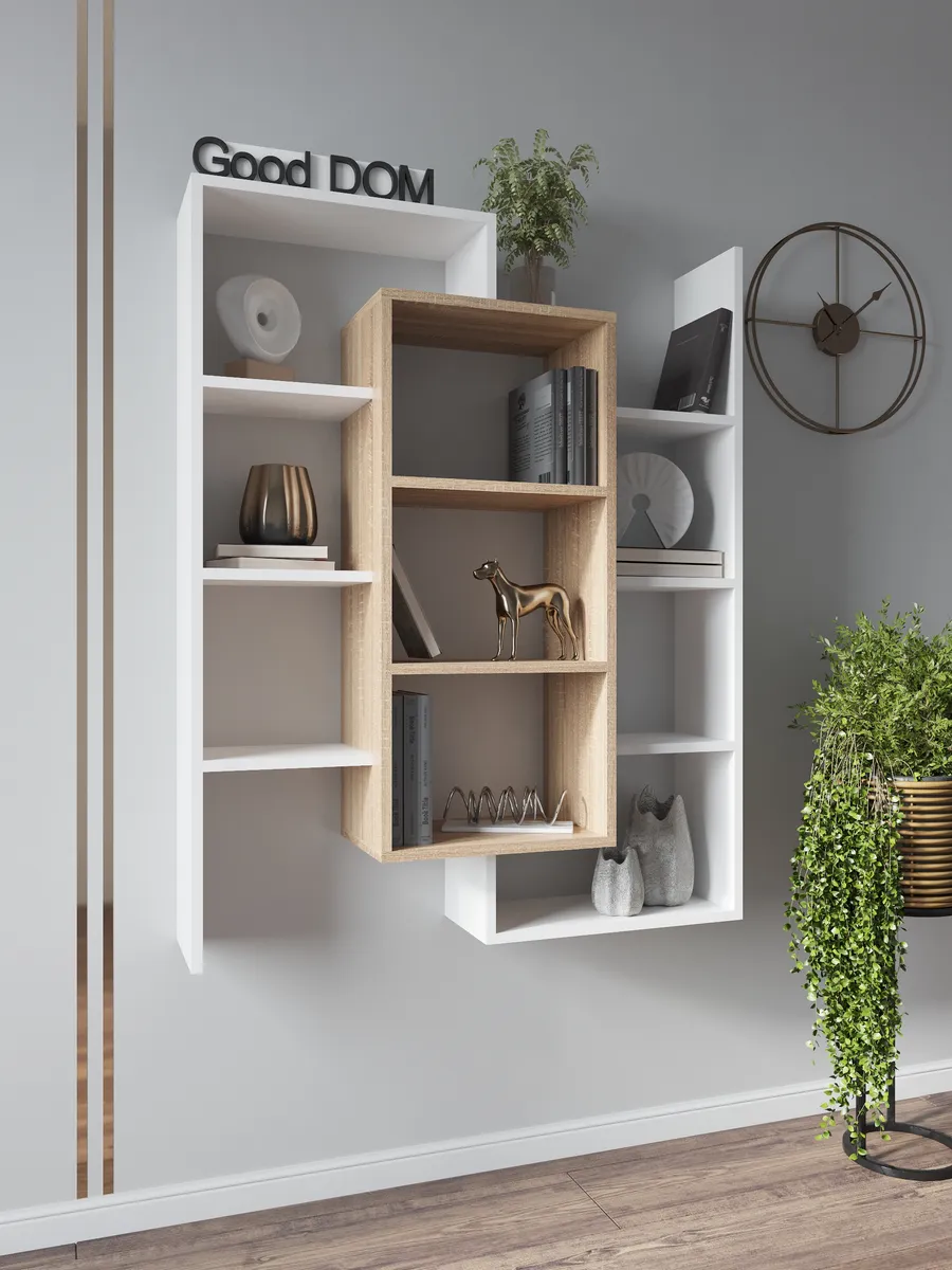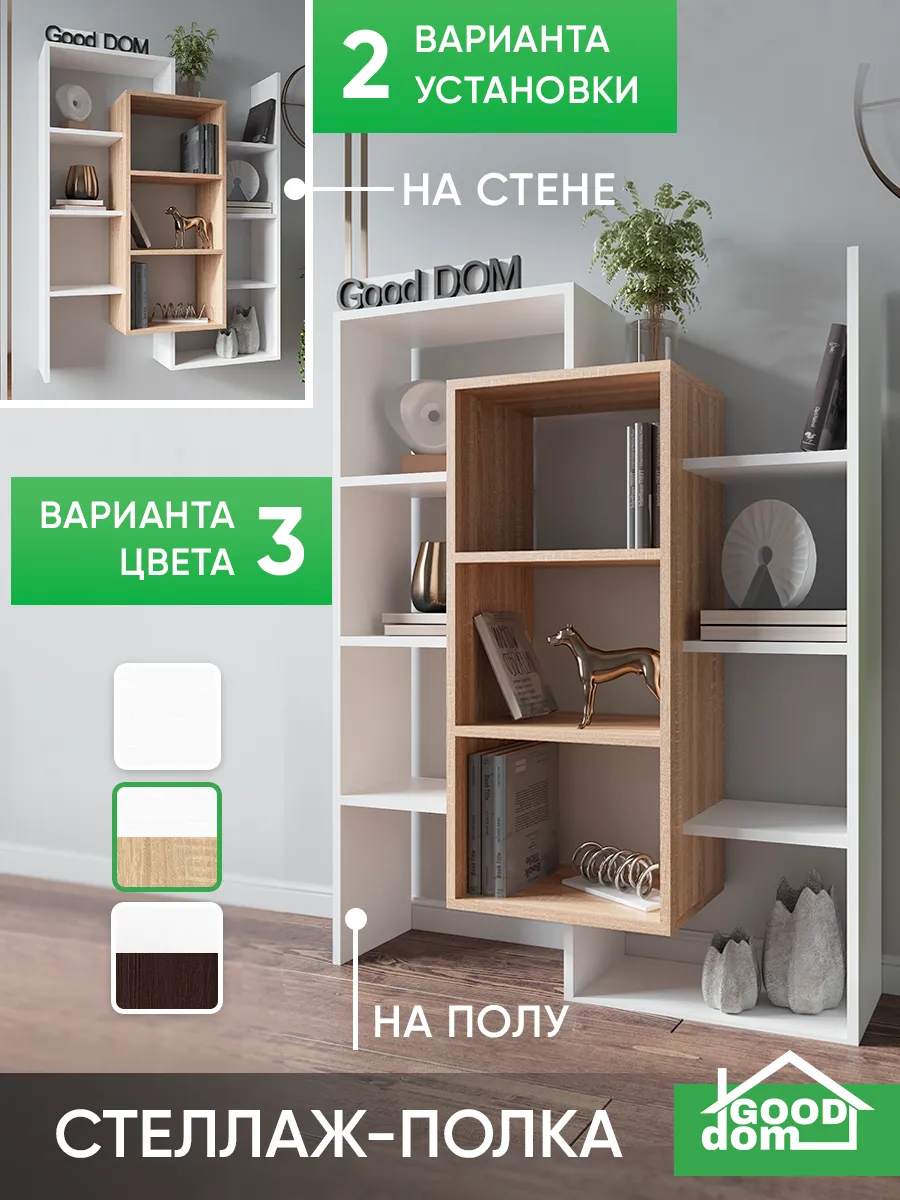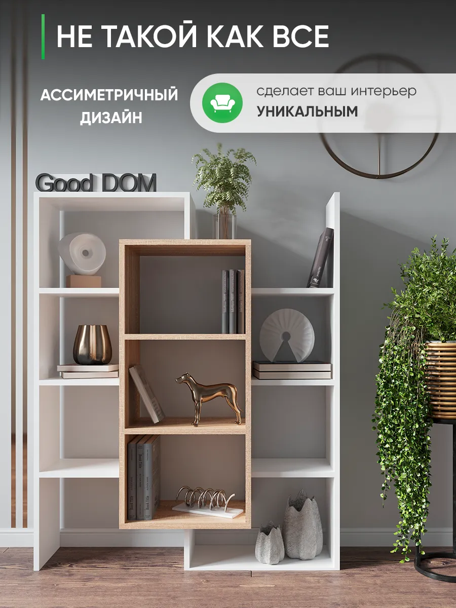 Стеллаж-полка «Лайм» универсальное интерьерное решение для любой комнаты. Стеллаж может быть размещен на полу как напольная полка с секциями, либо с помощью настенного крепления и использоваться как настенная полка. Множество открытых полок и поверхностей (секций) стелажа позволяют комфортно разместить декор, книги, цветы и остальные необходимые вам вещи, а необычная форма поможет сделать ваш интерьер интереснее. Шкаф вместительный, но узкий - что позволит с максимальной пользой использовать свободное пространство и уместить его даже в маленькой комнате. В настенной вариации «Лайм» станет вместительной книжной полкой, которая не будет занимать много места, а компактно размещаться на стене, освобождая площадь пола. Настенная полка или стеллаж решать вам. Три центральные полки наиболее глубокие и вместительные, остальные по бокам воздушные - что в сочетании создает современный и необычный дизайн. Стеллаж белый наиболее популярная модель, но есть еще несколько разных расцветок - вы можете выбрать именно тот цвет, который подходит под Ваш интерьер и сочетается с уже имеющейся мебелью. Данная модель отлично подойдёт как шкаф офисный, как стеллаж для игрушек в детскую, шкаф в спальню под необходимые мелочи и аксессуары. Еще одно применение - этажерка для игрушек, для размещения цветов и растений. Так же стеллаж может с легкостью стать книжным шкафом для удобного хранения любимых книг. Стеллаж в прихожей найдет свое место под аксессуары или сумки - открытый шкаф в коридор. Благодаря открытым полкам и нестандартному их расположению стеллаж часто используют в зонировании пространства как перегородку. Наш стеллаж изготовлен на новом оборудовании из высококачественных материалов ЛДСП. Мы дорожим качеством и внешним видом нашей продукции, поэтому вся продукция проверяется перед отправкой отделом контроля и упаковывается в коробки с дополнительной твердой защитой. В нашем ассортименте есть много интересных моделей мебели, что позволяет собрать комплект мебели от бренда Good дом, все в Дом, которая сочетается между собой. Чтобы посмотреть всё - просто нажмите на иконку логотипа.