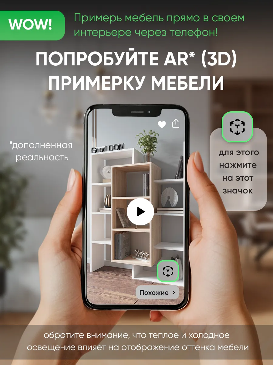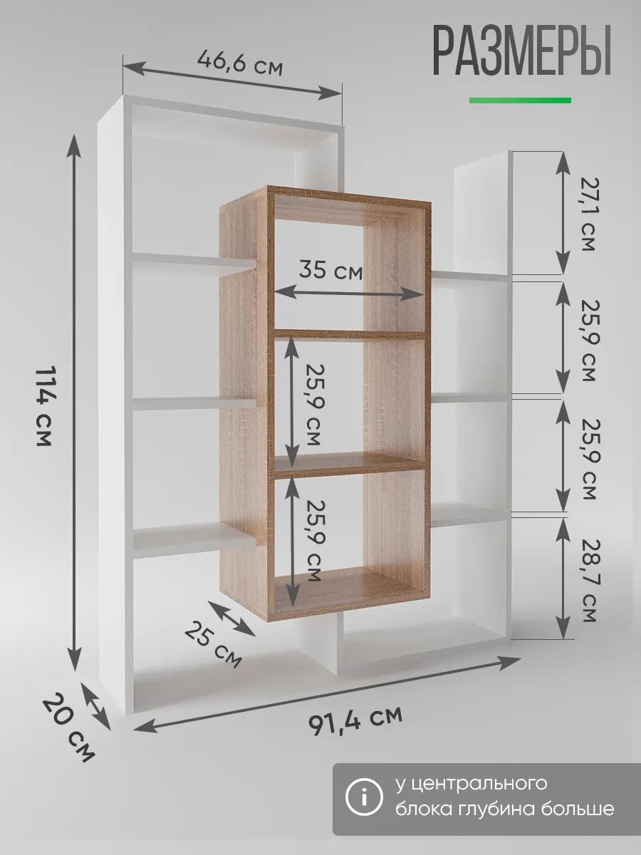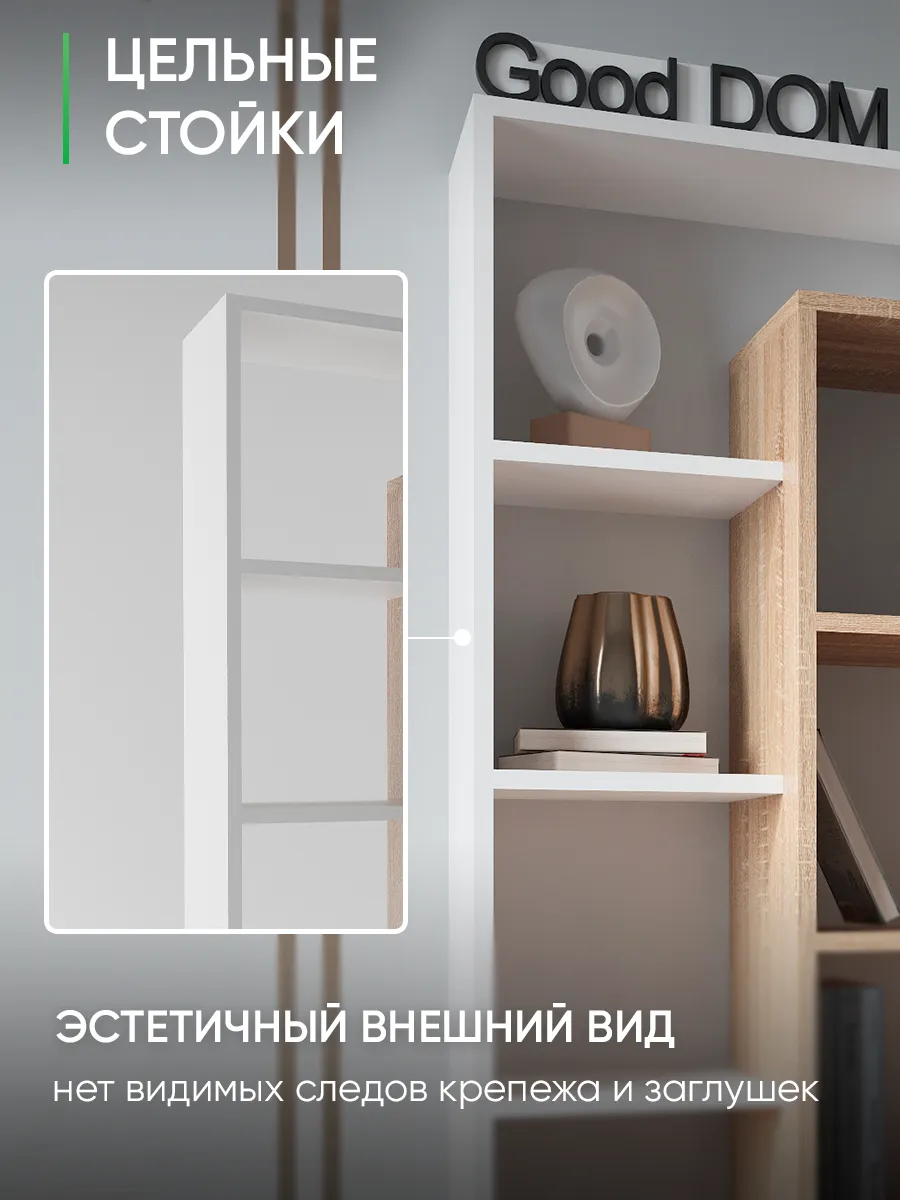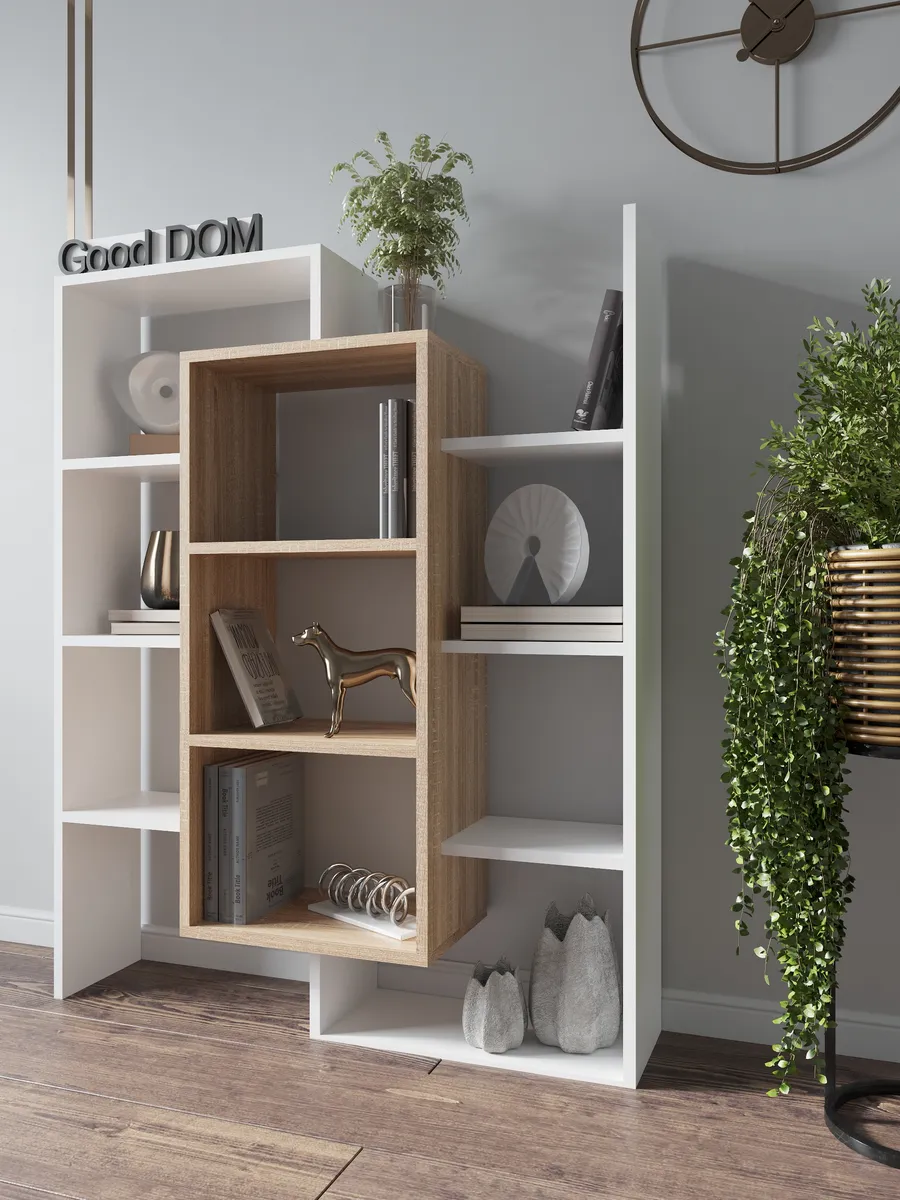 Стеллаж-полка «Лайм» универсальное интерьерное решение для любой комнаты. Стеллаж может быть размещен на полу как напольная полка с секциями, либо с помощью настенного крепления и использоваться как настенная полка. Множество открытых полок и поверхностей (секций) стелажа позволяют комфортно разместить декор, книги, цветы и остальные необходимые вам вещи, а необычная форма поможет сделать ваш интерьер интереснее. Шкаф вместительный, но узкий - что позволит с максимальной пользой использовать свободное пространство и уместить его даже в маленькой комнате. В настенной вариации «Лайм» станет вместительной книжной полкой, которая не будет занимать много места, а компактно размещаться на стене, освобождая площадь пола. Настенная полка или стеллаж решать вам. Три центральные полки наиболее глубокие и вместительные, остальные по бокам воздушные - что в сочетании создает современный и необычный дизайн. Стеллаж белый наиболее популярная модель, но есть еще несколько разных расцветок - вы можете выбрать именно тот цвет, который подходит под Ваш интерьер и сочетается с уже имеющейся мебелью. Данная модель отлично подойдёт как шкаф офисный, как стеллаж для игрушек в детскую, шкаф в спальню под необходимые мелочи и аксессуары. Еще одно применение - этажерка для игрушек, для размещения цветов и растений. Так же стеллаж может с легкостью стать книжным шкафом для удобного хранения любимых книг. Стеллаж в прихожей найдет свое место под аксессуары или сумки - открытый шкаф в коридор. Благодаря открытым полкам и нестандартному их расположению стеллаж часто используют в зонировании пространства как перегородку. Наш стеллаж изготовлен на новом оборудовании из высококачественных материалов ЛДСП. Мы дорожим качеством и внешним видом нашей продукции, поэтому вся продукция проверяется перед отправкой отделом контроля и упаковывается в коробки с дополнительной твердой защитой. В нашем ассортименте есть много интересных моделей мебели, что позволяет собрать комплект мебели от бренда Good дом, все в Дом, которая сочетается между собой. Чтобы посмотреть всё - просто нажмите на иконку логотипа.