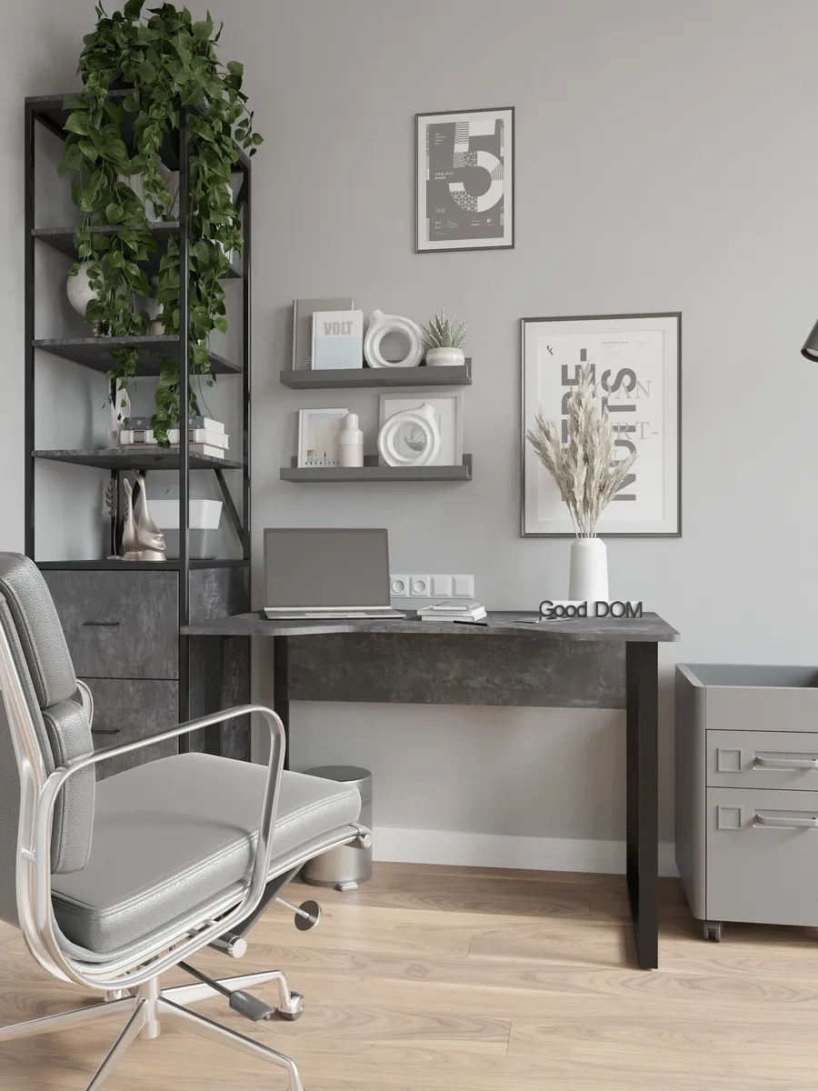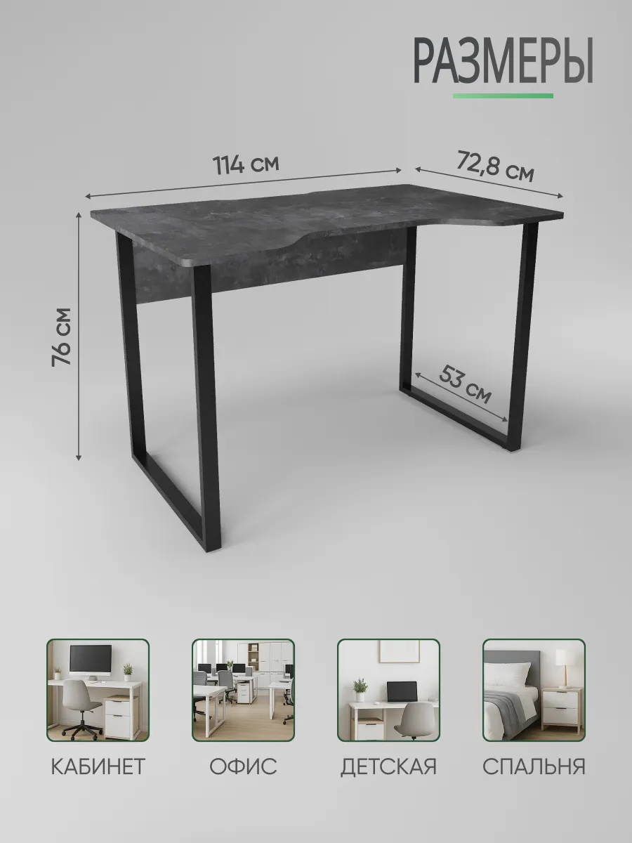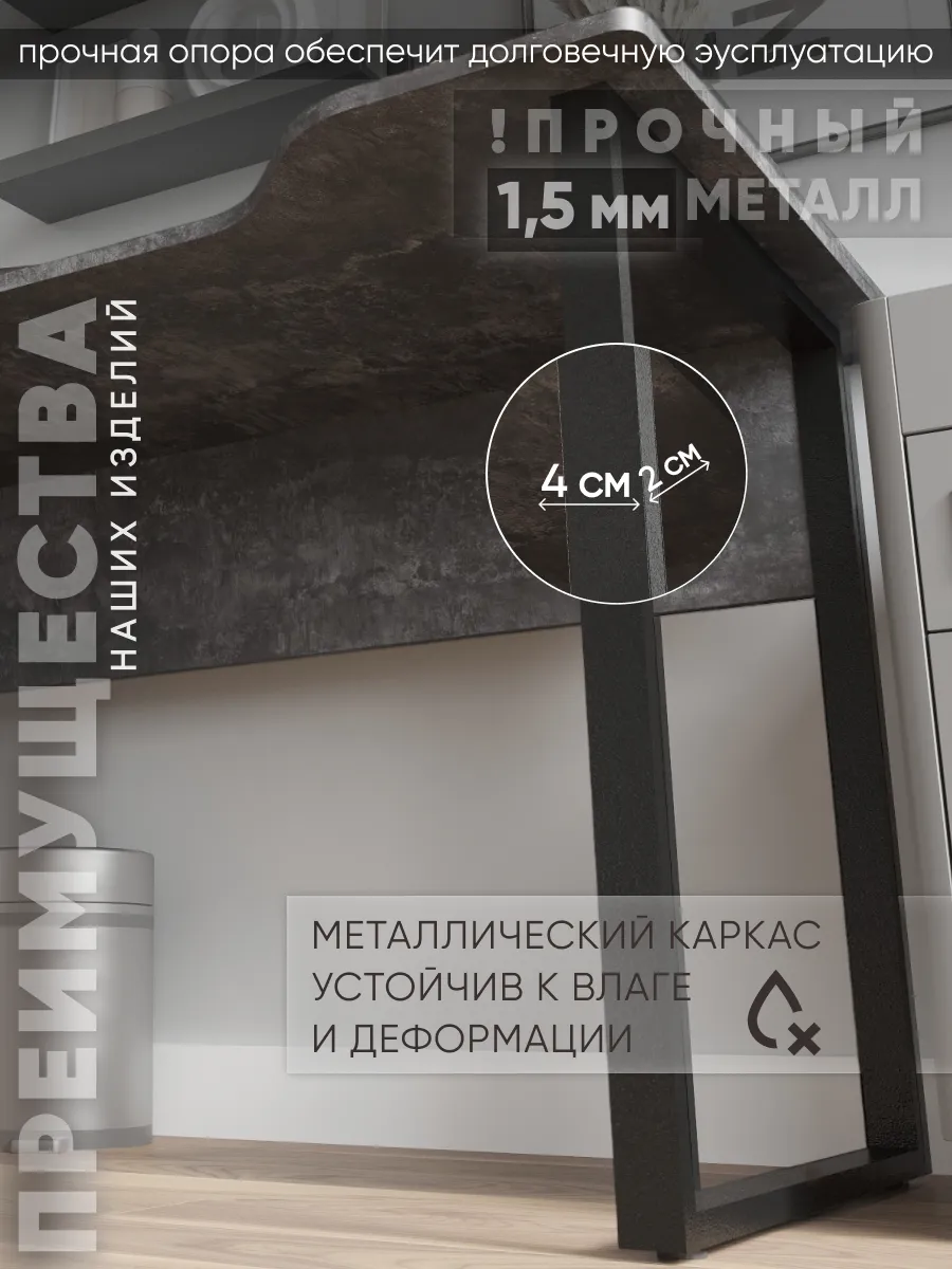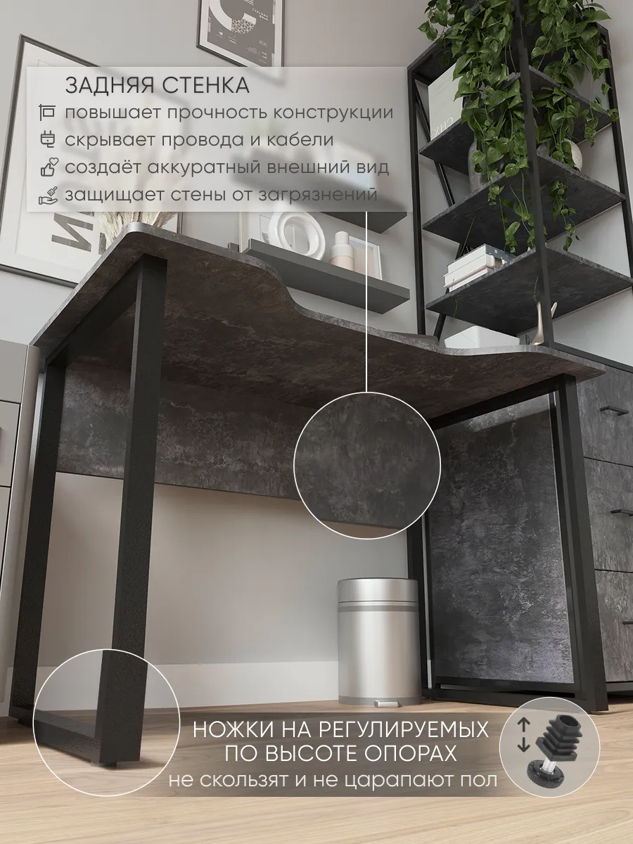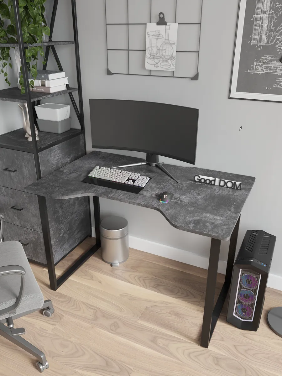 Прочная столешница выполнена из экологичной ЛДСП в актуальных и универсальных расцветках. Устойчива к царапинам и влаге. Надёжный и массивный каркас стола из металла придаёт конструкции стабильность и выдерживает интенсивную нагрузку — подходит как для учёбы, повседневной работы, так и для гейминга.