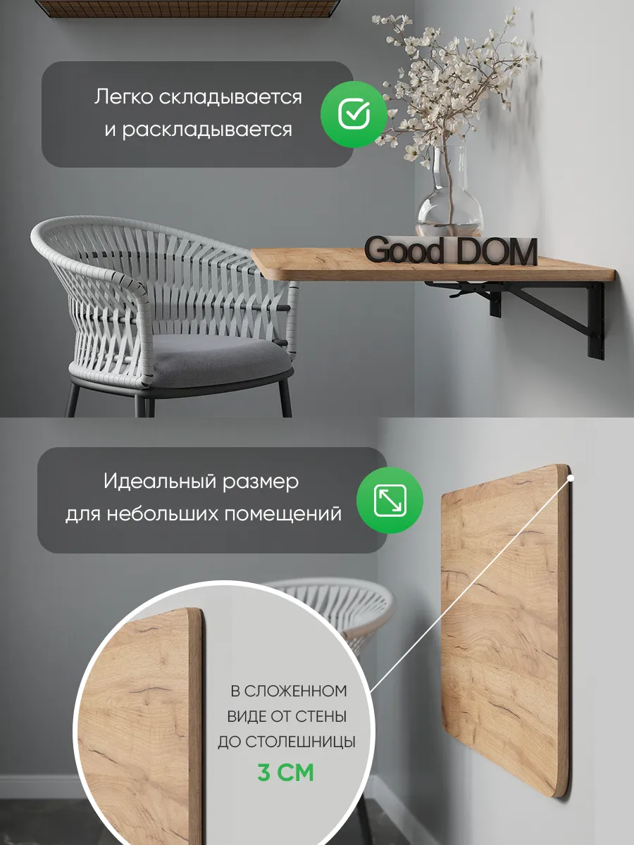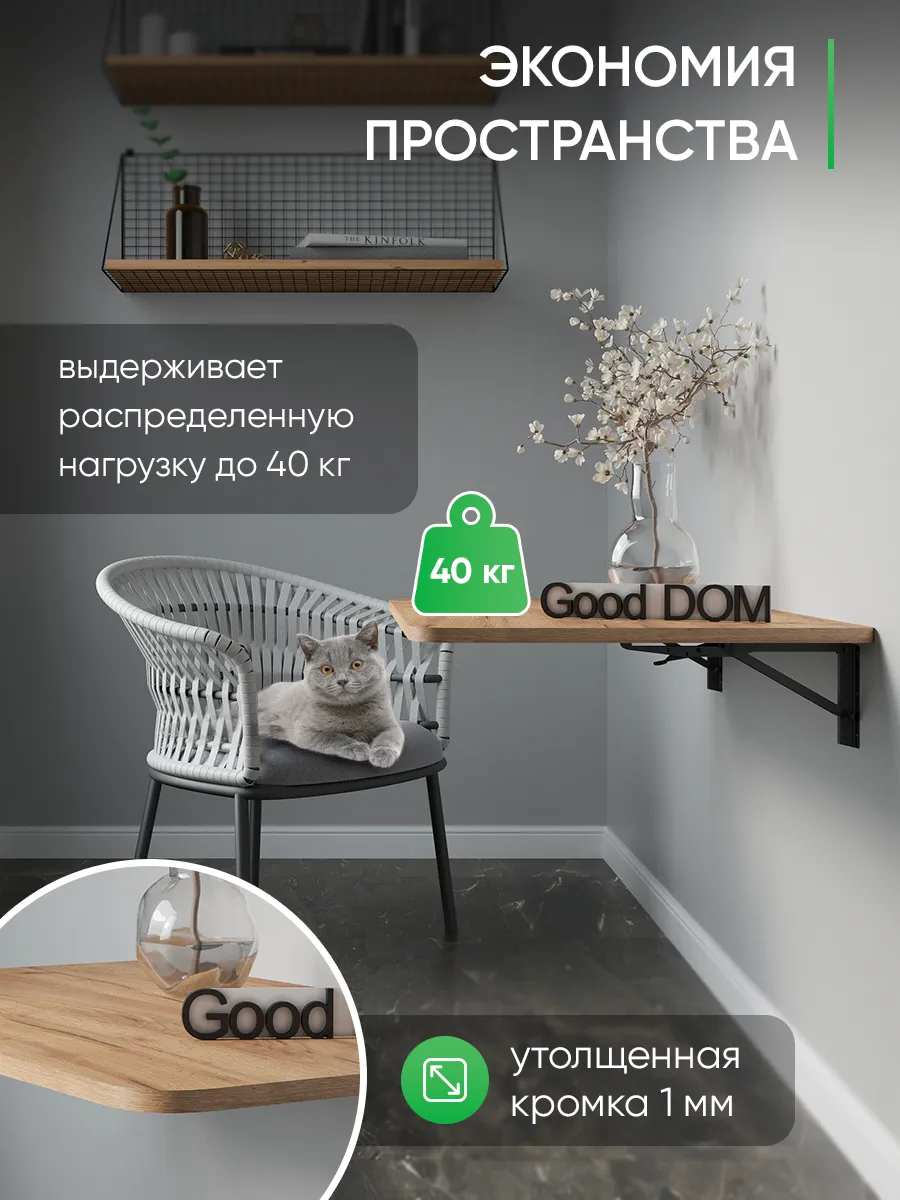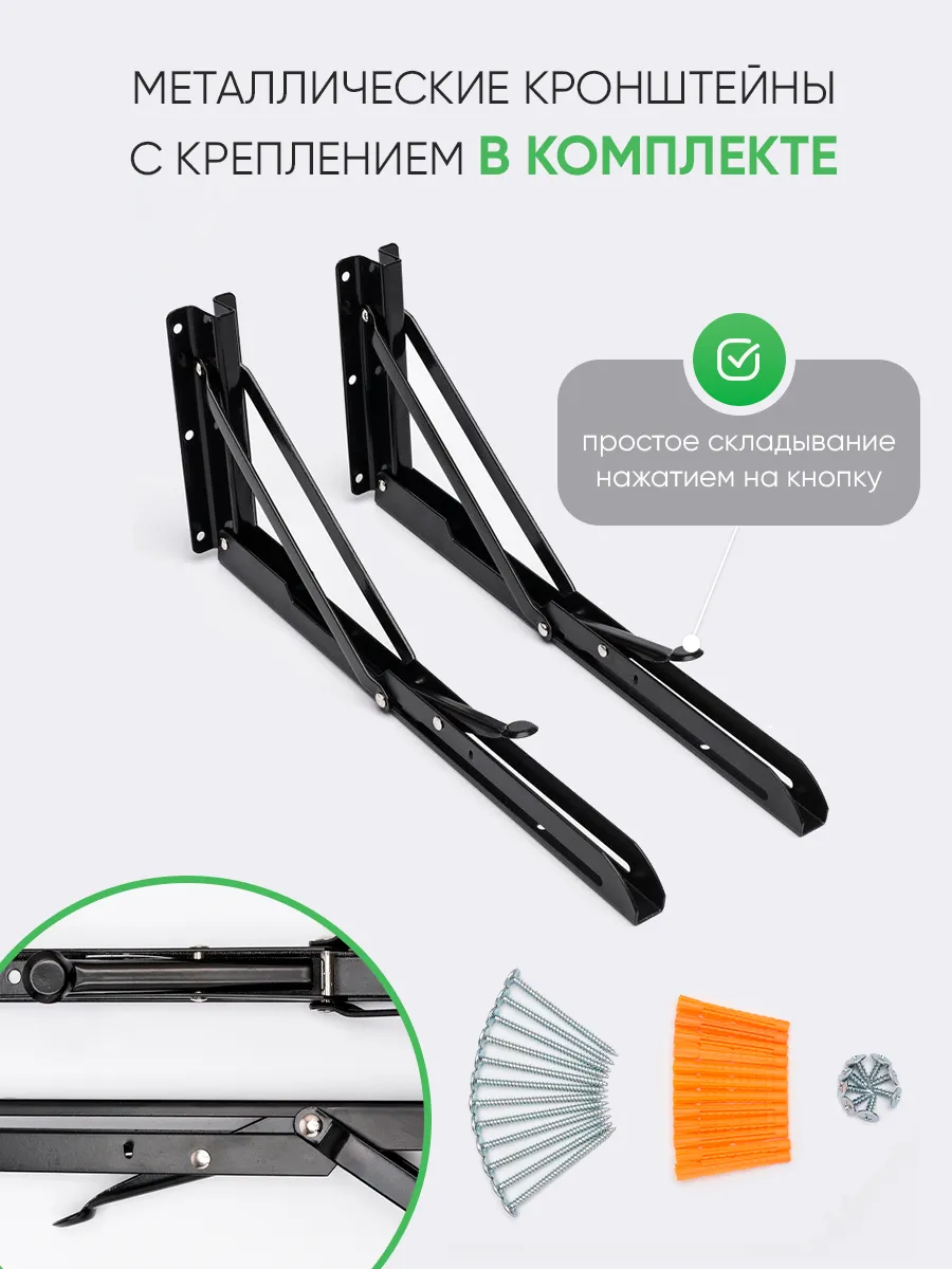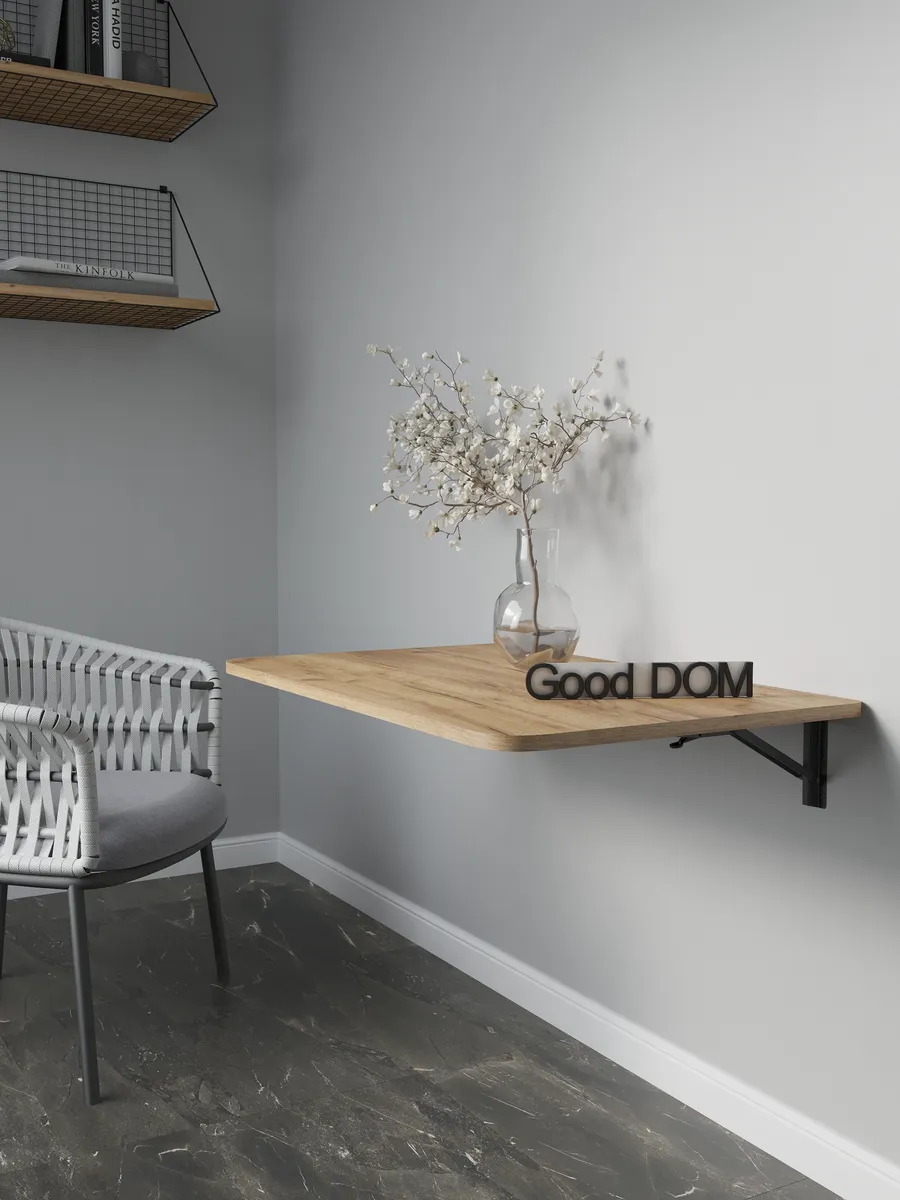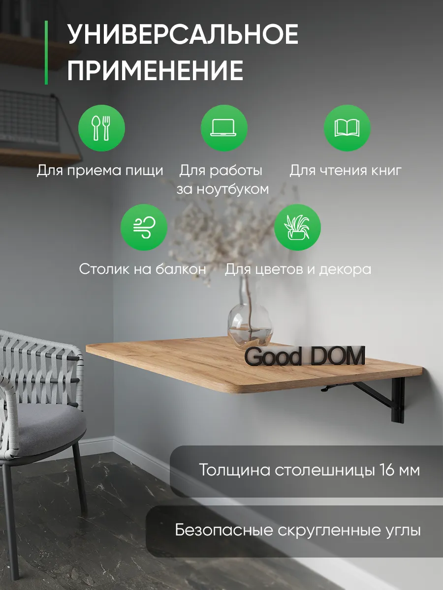 Откидной настенный стол “Сатурн” со своей конструкцией и креплениями к стене отлично подойдет в качестве мебели на кухню, балкон, в загородный дом (для дачи), в любую комнату. Отменное качество мебели может служить Вам долгое время в качестве обеденного, письменного, журнального, компьютерного стола. Стол откидной можно установить абсолютно в любое помещение, где Вам необходимо. Требуется лишь вертикальная поверхность, к которой он крепится надежными креплениями из стали. Конструкция стола позволяет выдерживать распределенную нагрузку до 40 кг. Поэтому складной стол настенный предполагает очень широкое применение. На кухне и даче на нем можно выполнять любые хозяйственные работы: резать продукты, месить тесто, ставить на него тяжелые кастрюли. В комнате за столом удобно писать, механизм для откидного стола обеспечивает легкий поворот и надежную фиксацию. Качественная, удобная и совсем недорогая конструкция решит ваши проблемы: не будет ни тесноты, ни обид. В небольших помещениях, таких как балкон и лоджия, можно организовать уютное место для отдыха, за столиком приятно попить чай или кофе, полистать журналы и почитать книги, газеты. В сложенном виде стол выглядит как просто дощечка, прижатая к стене, а в разложенном - удобная, прочная и многофункциональная поверхность. Стол на стену изготовлен из ЛДСП - материала крепкого, надежного и долговечного. Товар сертифицирован, соответствует ГОСТам, действует гарантия от производителя. В сложенном виде от стены до столешницы 3 см. + столешница 1,6 см.