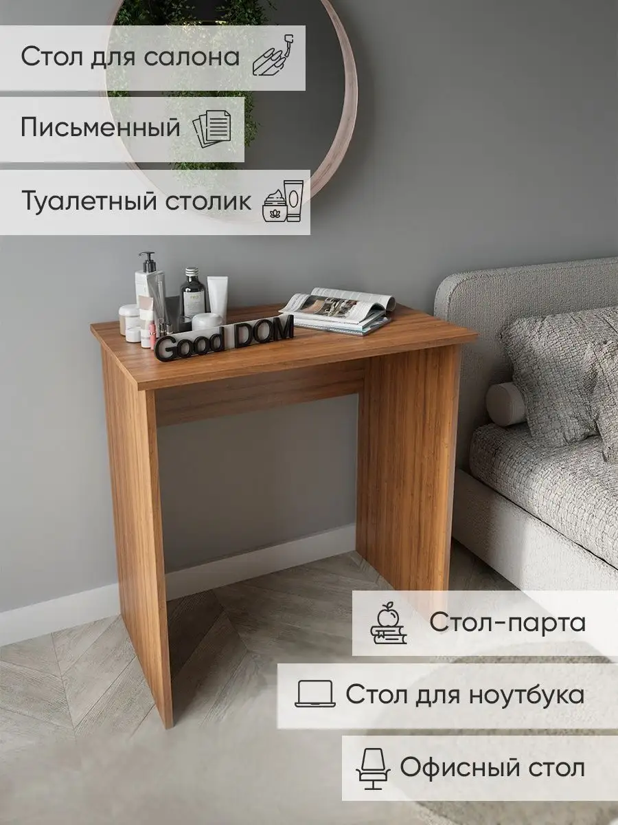 Нужно рабочее место, стол, но в комнату его, кажется, уже не уместить - все и так заставлено? Присмотритесь к нашему небольшому письменному столу! Благодаря его компактным размерам, узкому столику уголок в вашей квартире непременно найдется место даже в маленькой комнате. Стол компьютерный подойдет в гостиную для ноутбука, как стол для пк, в детскую - как рабочий стол школьника ученика как парта, как стол туалетный (гримерный стол) для косметики в спальню, - везде, где есть немного свободного места. Так же столик отлично подойдёт как офисный стол, или в салон - маникюрный столик, стол визажиста. Минималистичное исполнение позволяет деревянному столу не бросаться в глаза, он почти незаметен. Цвета: белый, дуб сонома, орех. Размеры: высота-75 см, ширина-74 см, глубина-45 см, вес-12,4 кг.