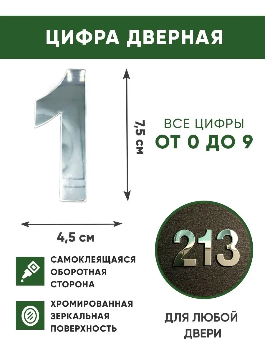 Цифра для входной двери (номерок) в цвете хром, обратная сторона самоклеящаяся, что упрощает установку номерка. Поверхность цифры хромированная, за счет чего номер на дверь выглядит очень модно и стильно. Клеевой слой нанесён на обратную сторону и закрыт защитной плёнкой. Чтобы приклеивание было долговечным - поверхность для наклеивания должна быть гладкой, чистой и сухой.
