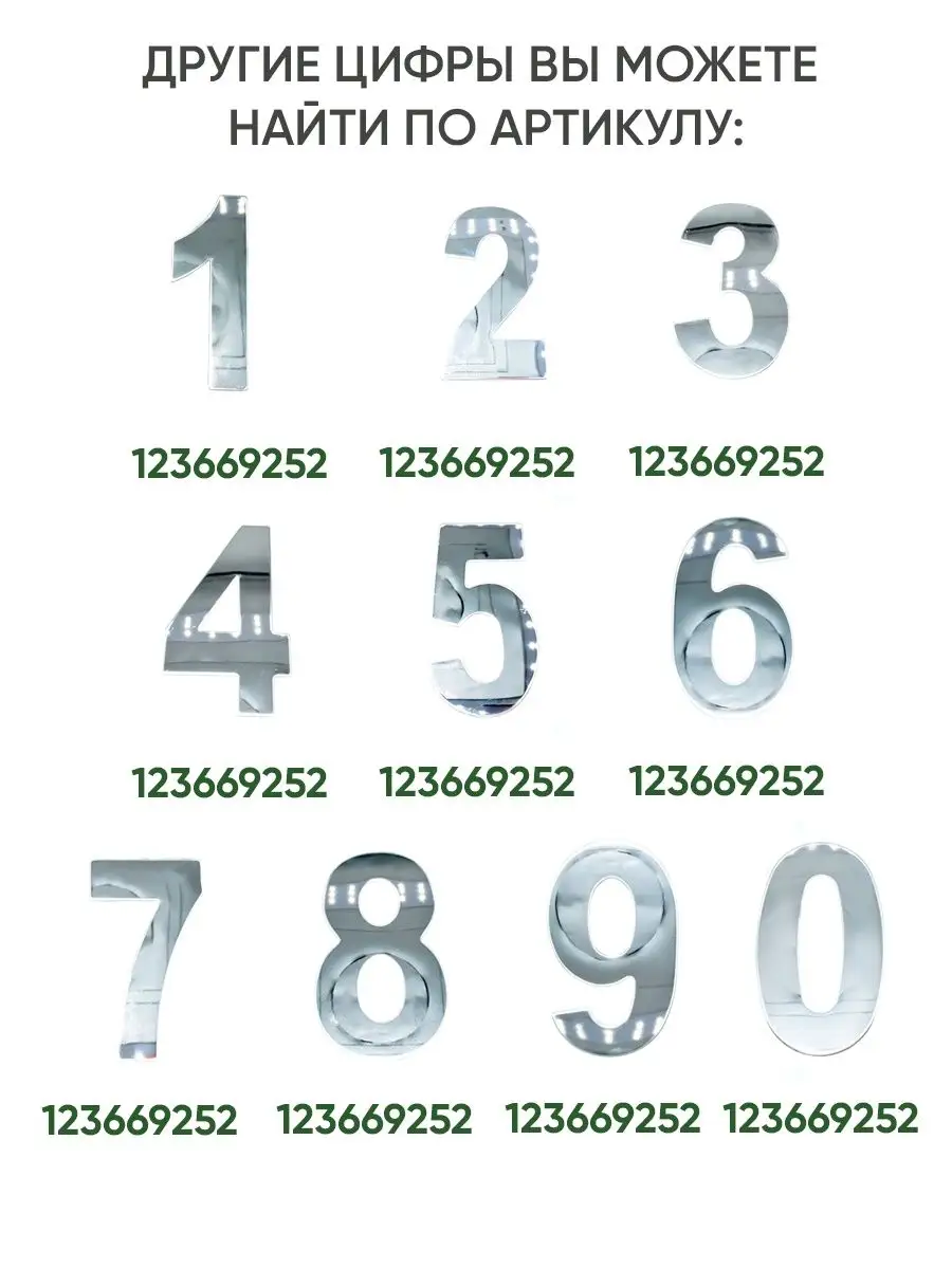 Цифра для входной двери (номерок) в цвете хром, обратная сторона самоклеящаяся, что упрощает установку номерка. Поверхность цифры хромированная, за счет чего номер на дверь выглядит очень модно и стильно. Клеевой слой нанесён на обратную сторону и закрыт защитной плёнкой. Чтобы приклеивание было долговечным - поверхность для наклеивания должна быть гладкой, чистой и сухой.
