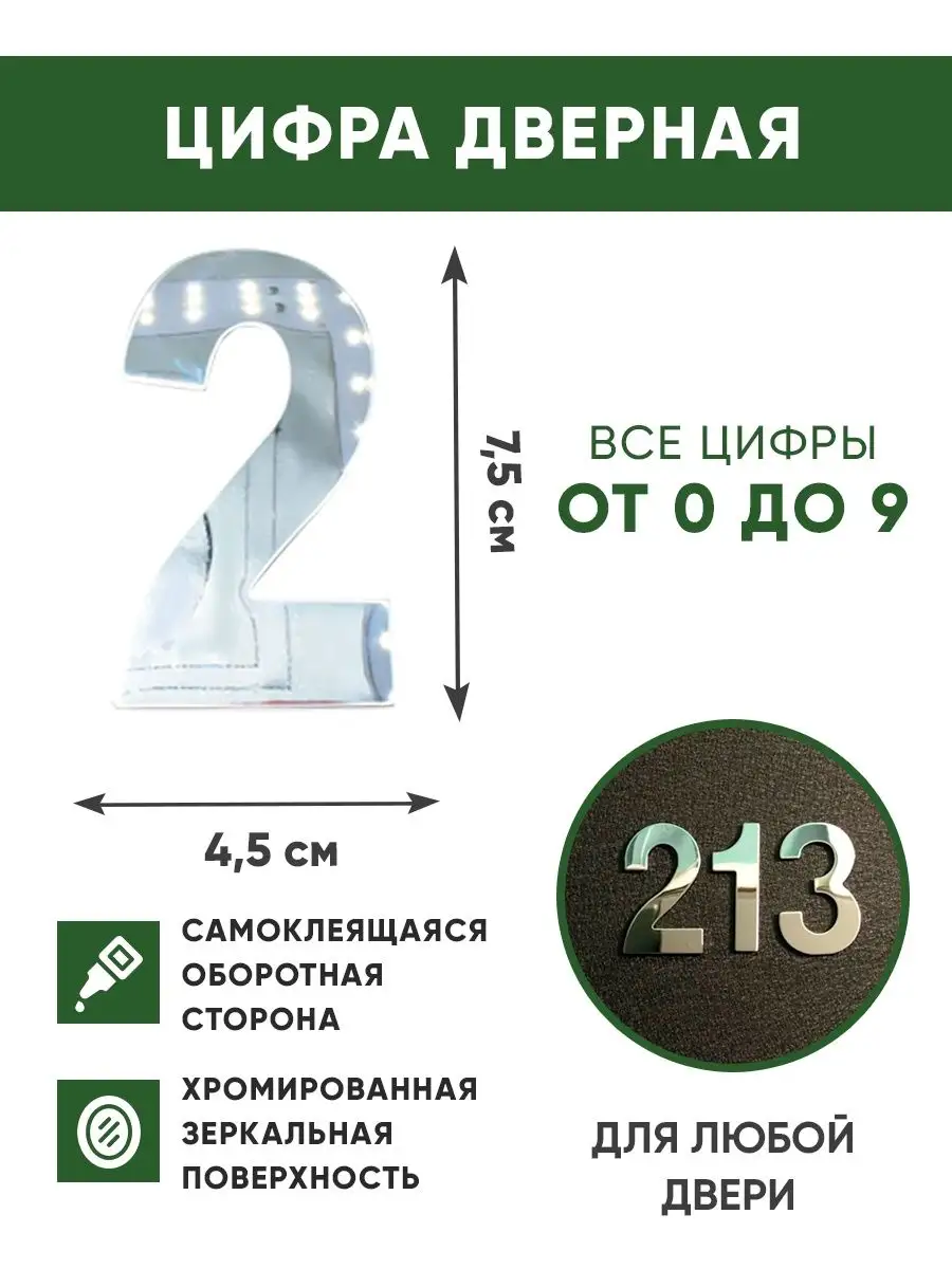 Цифра для входной двери (номерок) в цвете хром, обратная сторона самоклеящаяся, что упрощает установку номерка. Поверхность цифры хромированная, за счет чего номер на дверь выглядит очень модно и стильно. Клеевой слой нанесён на обратную сторону и закрыт защитной плёнкой. Чтобы приклеивание было долговечным - поверхность для наклеивания должна быть гладкой, чистой и сухой.