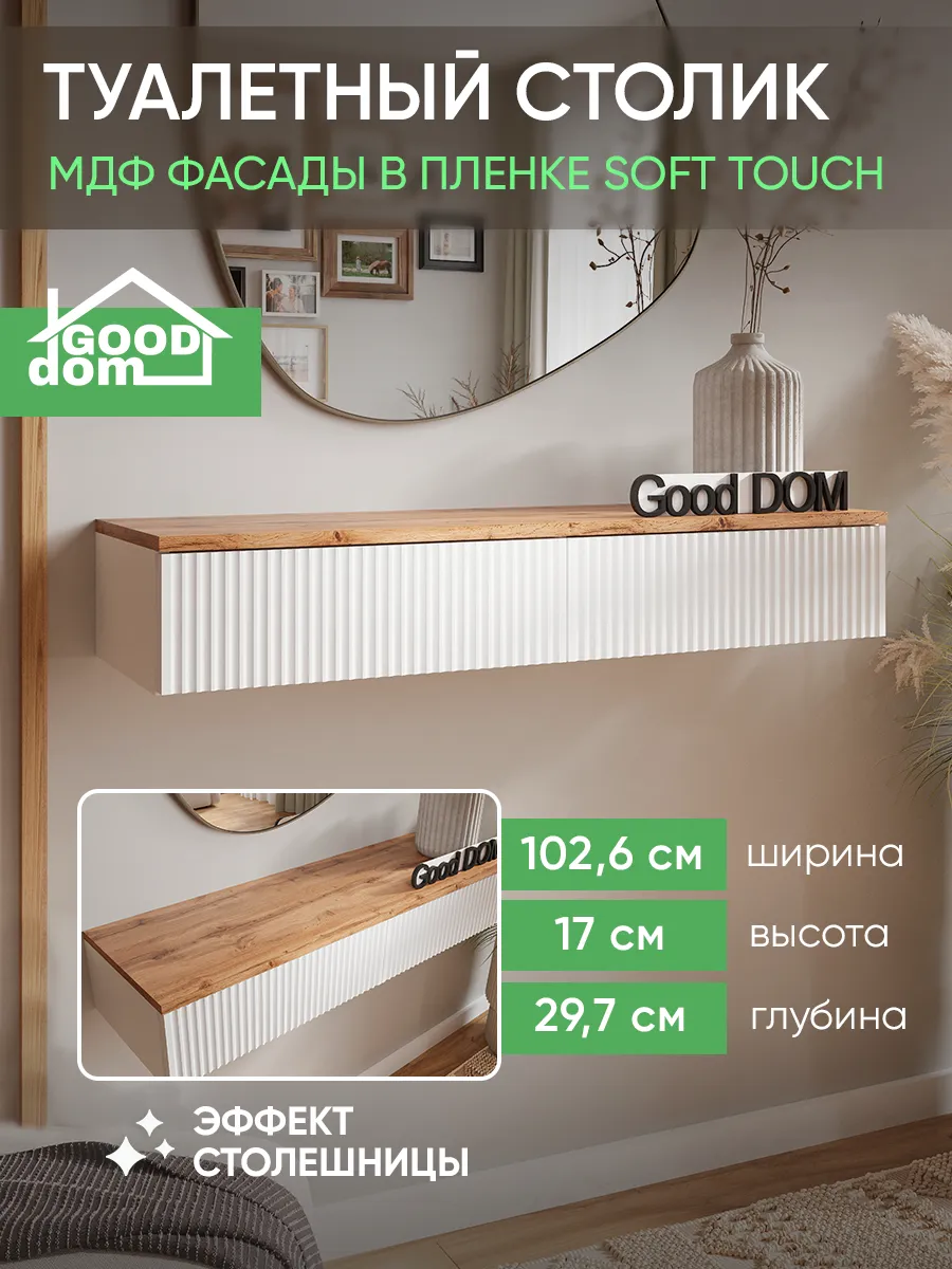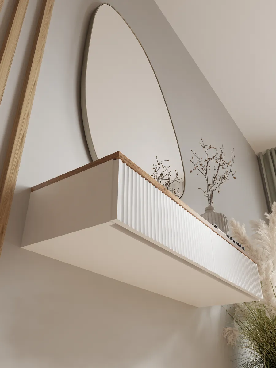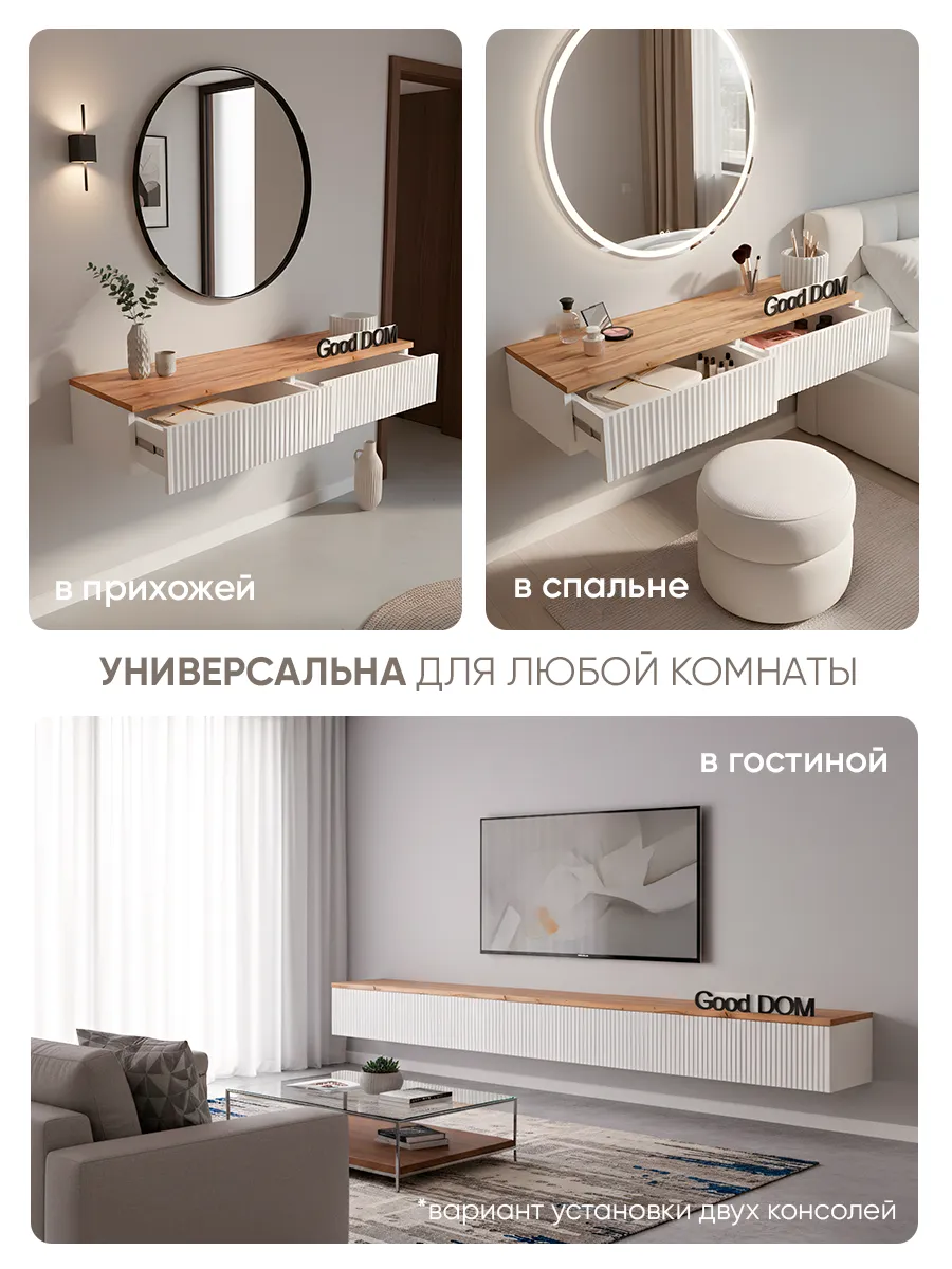 Зеркало в комплекте помогает создать полный образ. А если вы мечтаете о классическом трельяже, обратите внимание: конструкция стола позволяет при желании заменить стандартное зеркало на трехстворчатое, превратив зону в профессиональную гримерную. Настенный или напольный вариант монтажа позволяет выбрать оптимальный способ установки под ваш интерьер. Золотые акценты на фурнитуре добавляют изделию изысканности и подчеркивают его уникальность.