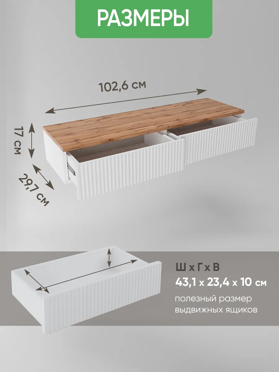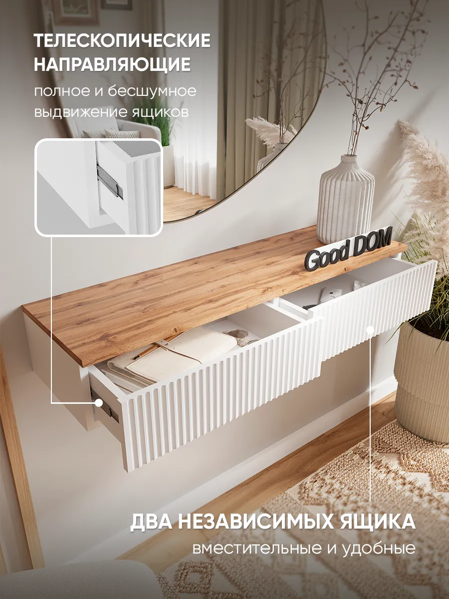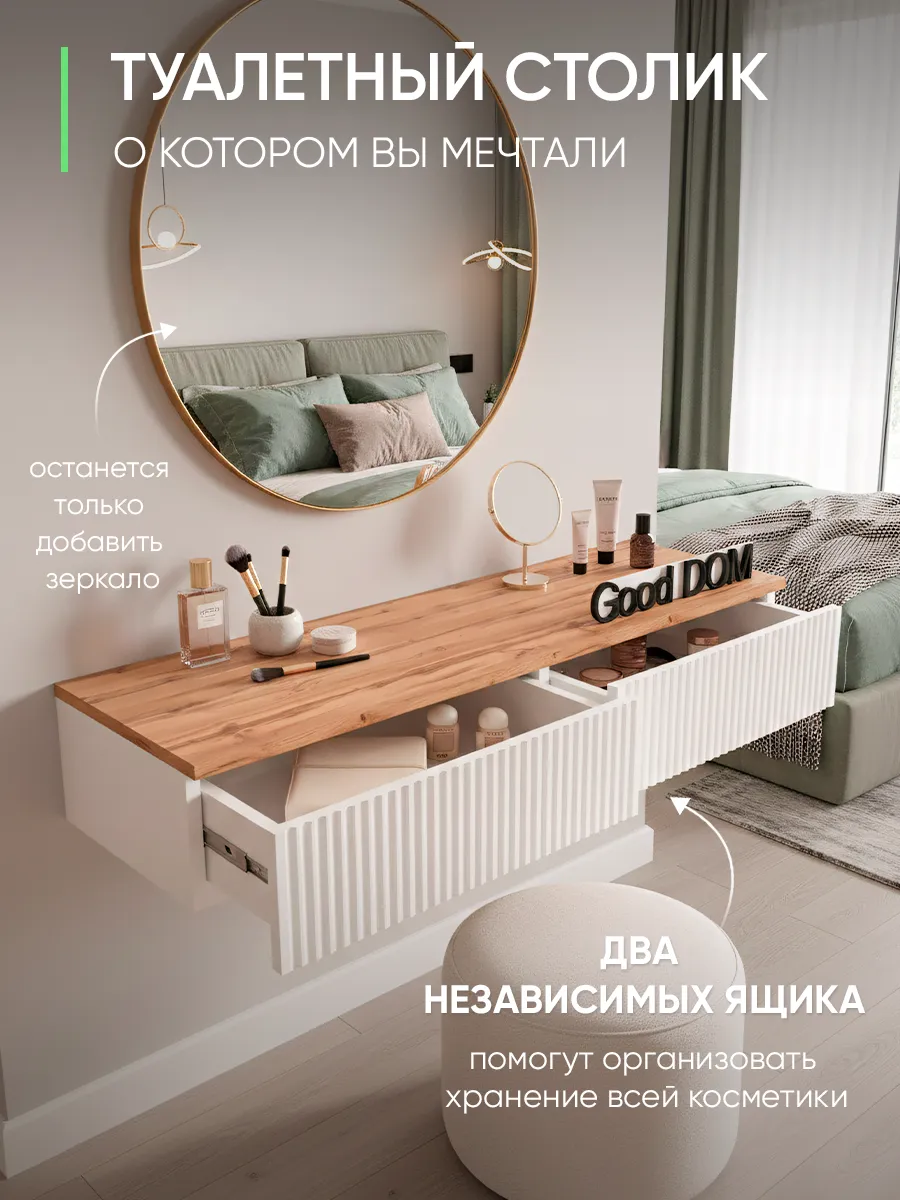 В конструкции предусмотрен навесной шкафчик с двумя ящиками, которые позволяют аккуратно хранить косметику и аксессуары. Благодаря этому столик превращается в удобный будуарный столик, где всегда под рукой все необходимое для ежедневных сборов. Гримерный стол отлично справляется с ролью парикмахерского и косметического уголка, обеспечивая комфорт при нанесении макияжа или укладке волос.