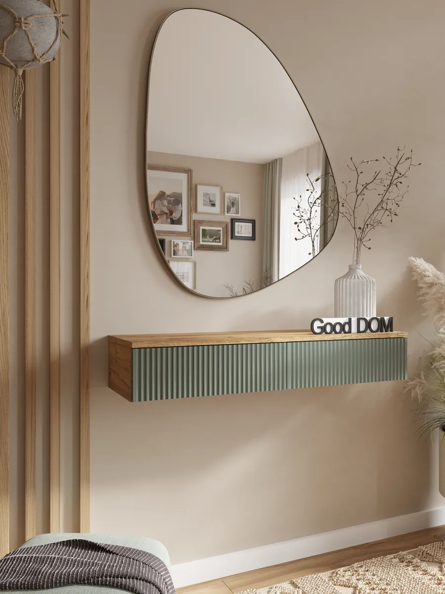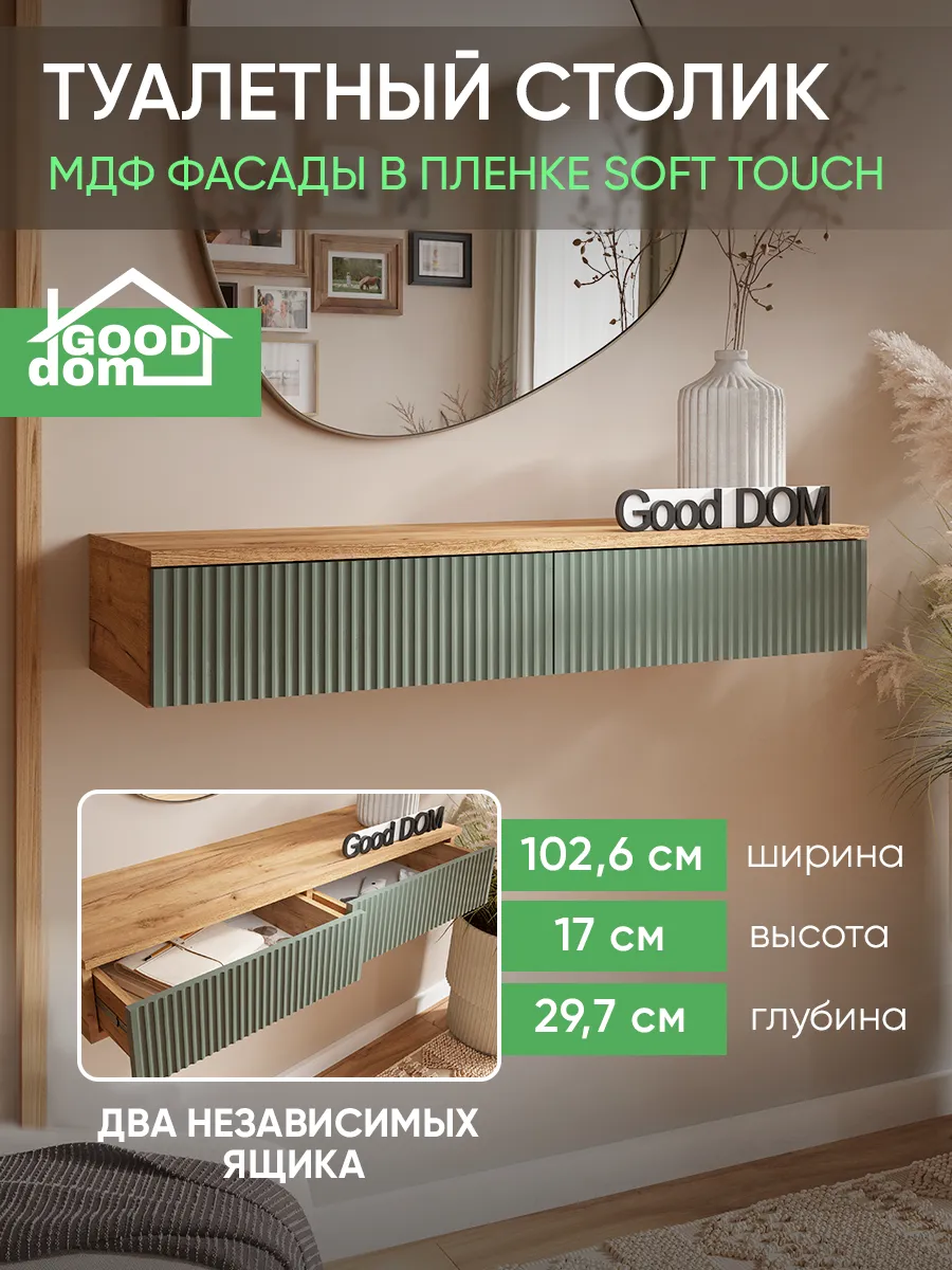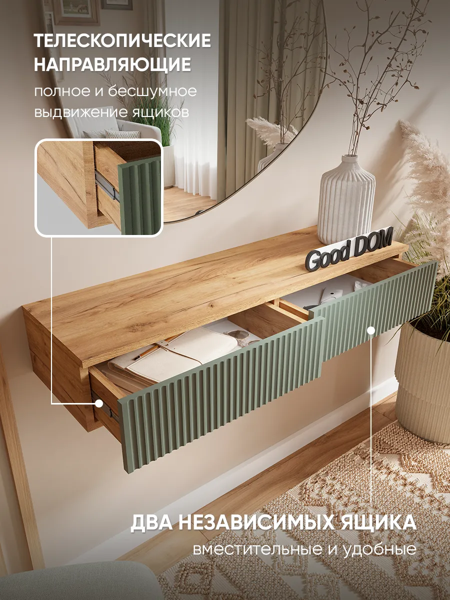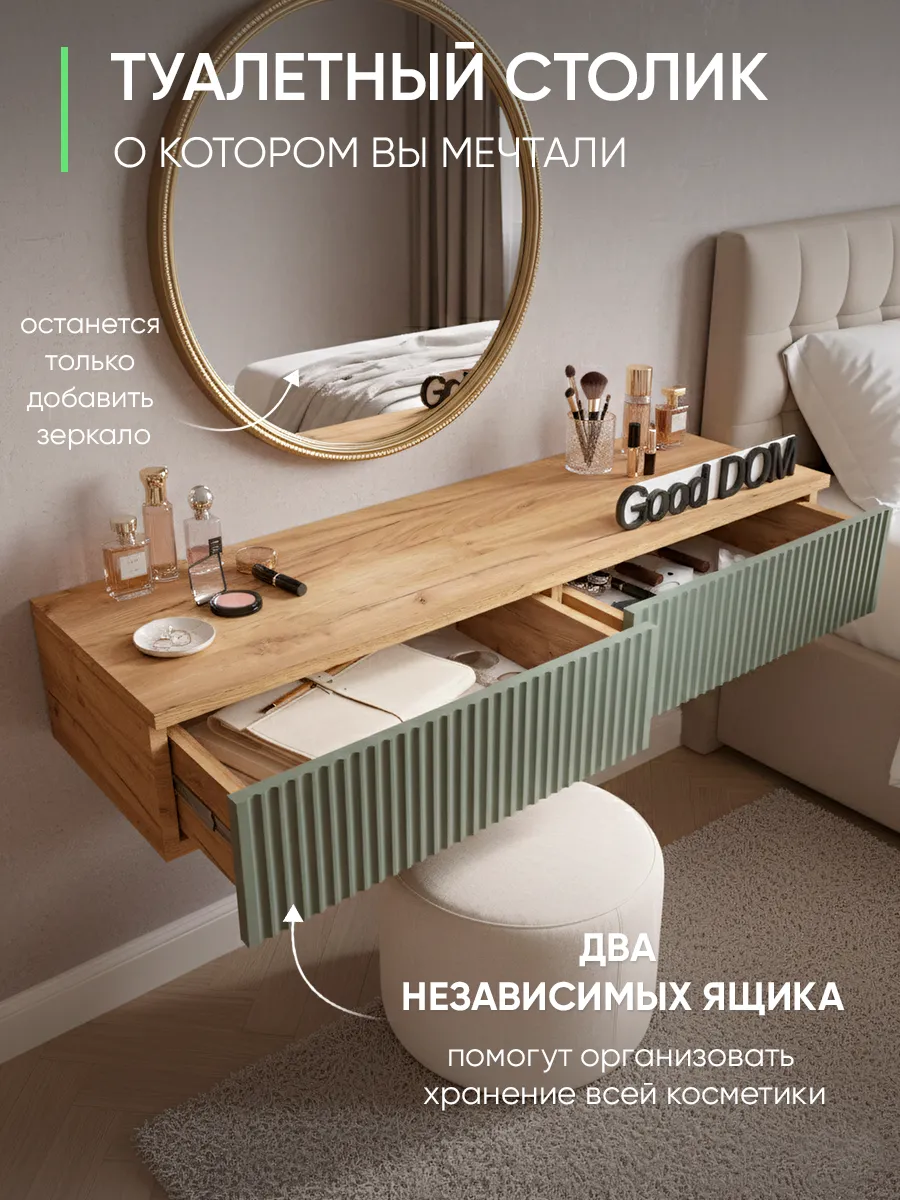 Настенный или напольный вариант монтажа позволяет использовать стол как гримерный или парикмахерский, а также как прикроватный или журнальный столик. Золотой акцент на фурнитуре добавляет изысканности и подчеркивает уникальность изделия. Стол отлично впишется в интерьер с оттенками оливкового и зеленого, создавая гармонию с окружающей мебелью и стенами.
