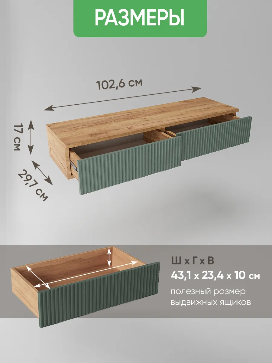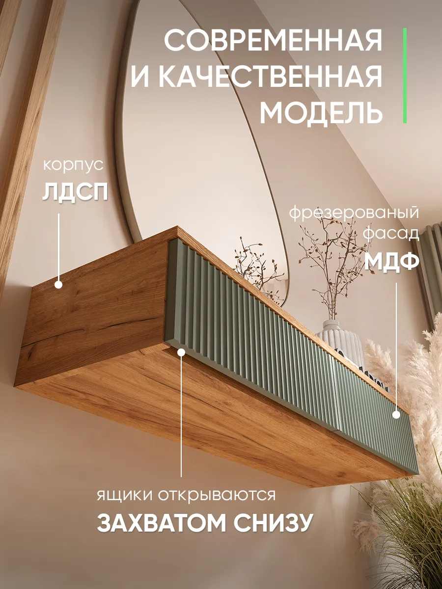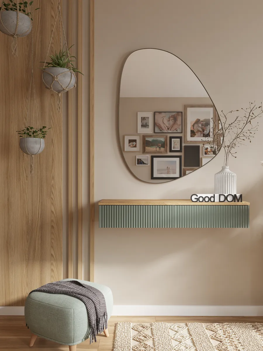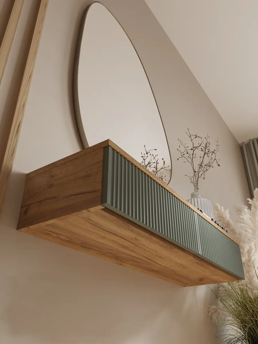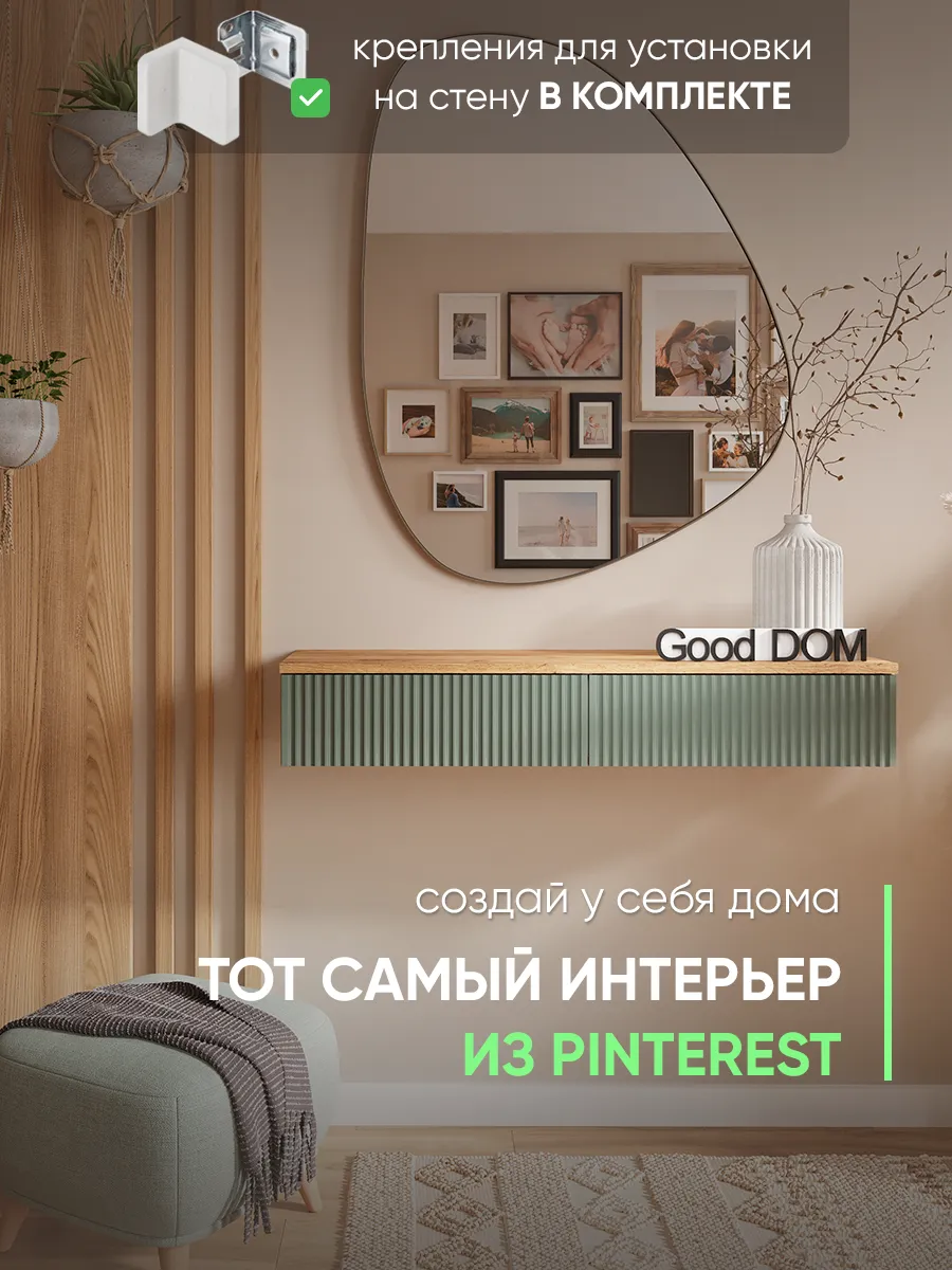 Настенный или напольный вариант монтажа позволяет использовать стол как гримерный или парикмахерский, а также как прикроватный или журнальный столик. Золотой акцент на фурнитуре добавляет изысканности и подчеркивает уникальность изделия. Стол отлично впишется в интерьер с оттенками оливкового и зеленого, создавая гармонию с окружающей мебелью и стенами.