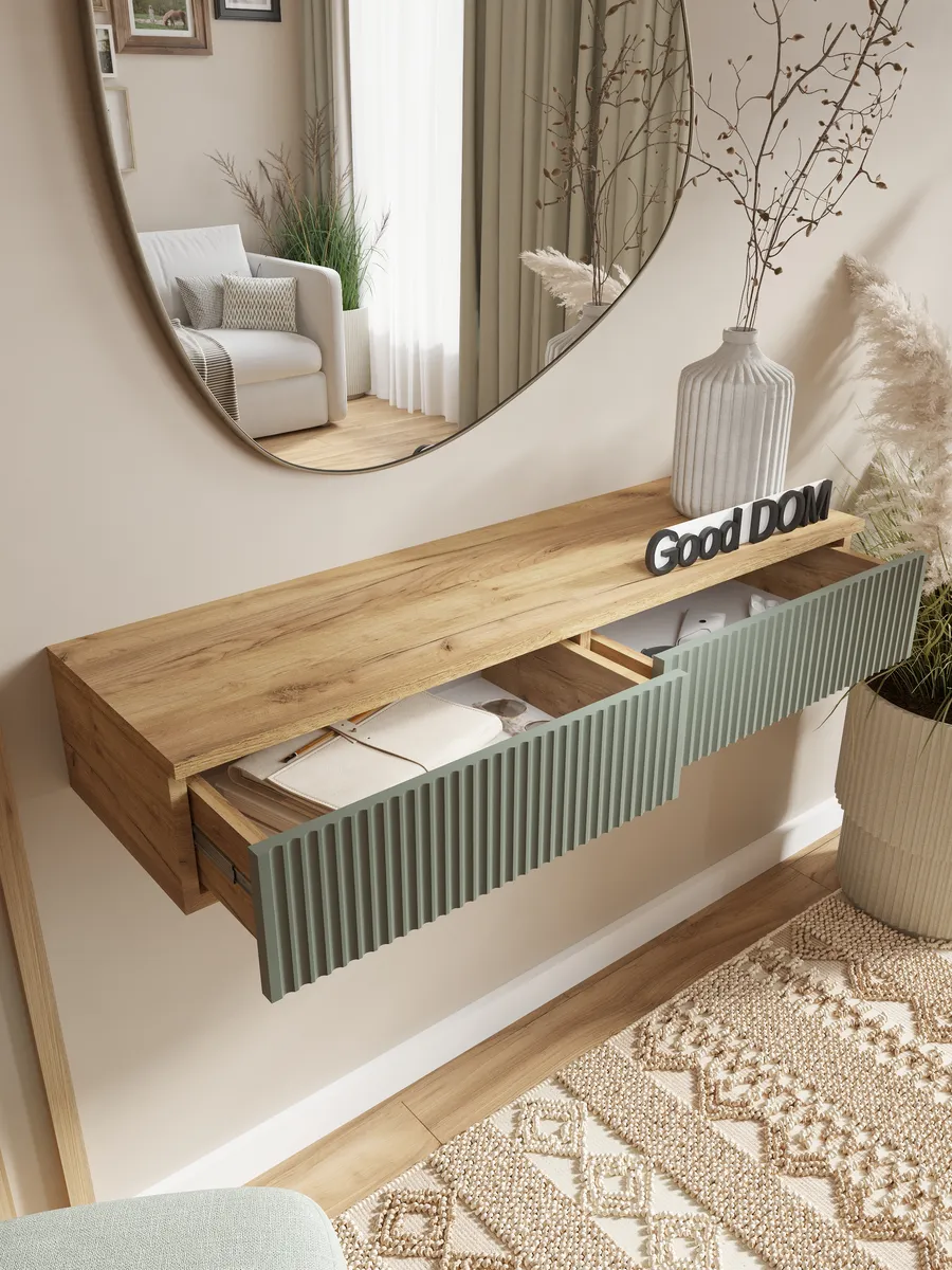 Этот консольный туалетный стол с зеркалом станет стильным украшением спальни, гостиной или прихожей. Компактная модель (102,6×29,7×17 см) выполнена из материалов с рифленым фасадом в оттенках дуба и коричневого кашемира, что придает интерьеру уют и естественность. Два вместительных ящика обеспечивают удобное хранение косметики и аксессуаров, помогая поддерживать идеальный порядок.