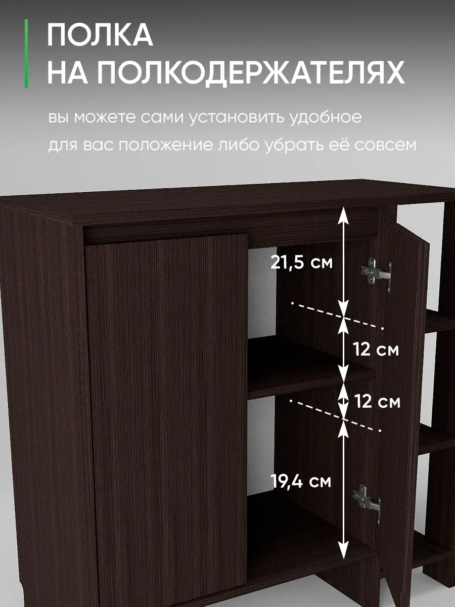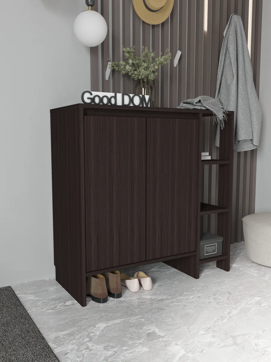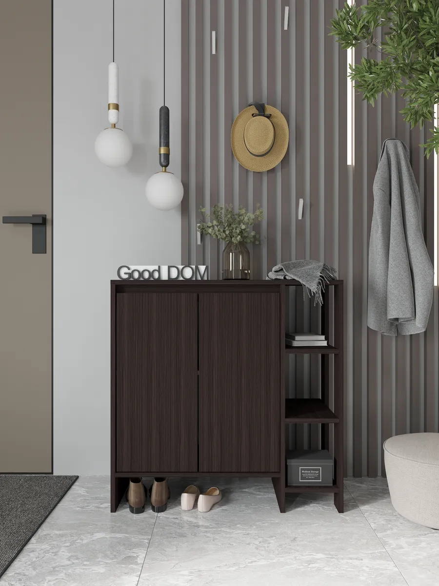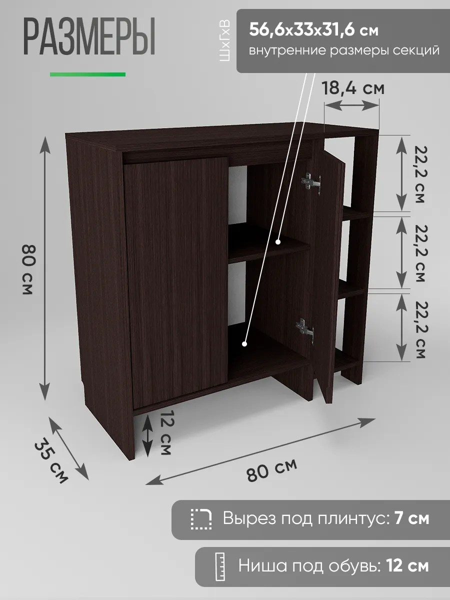 Деревянная тумба в оттенке венге — практичное решение для аккуратного хранения. За фасадами с распашными дверцами предусмотрено место для вещей, а открытая секция с полками удобна для повседневных мелочей и декора. Модель высокая, при этом узкая по глубине и визуально маленькая, но одновременно большая по вместимости: сверху широкая столешница, снизу — ниша для обуви и вырез под плинтус, чтобы изделие плотно встало у стены. По задумке дизайна это и настенная по виду композиция, и устойчивая конструкция, которая гармонично смотрится в стиле лофт.