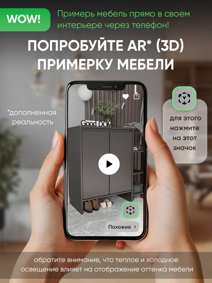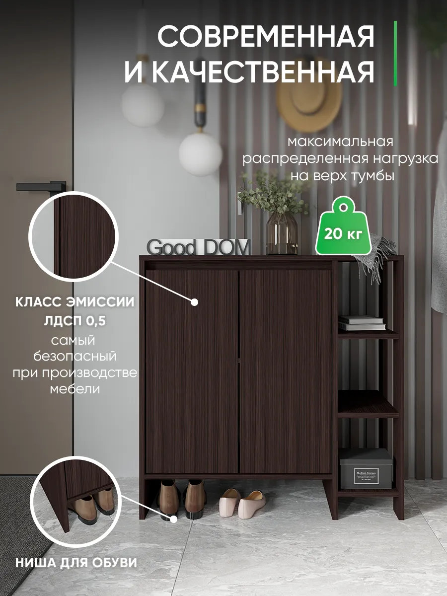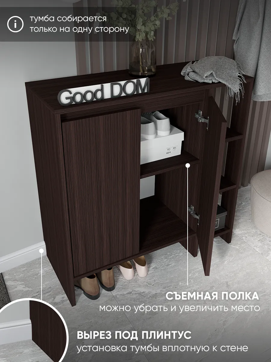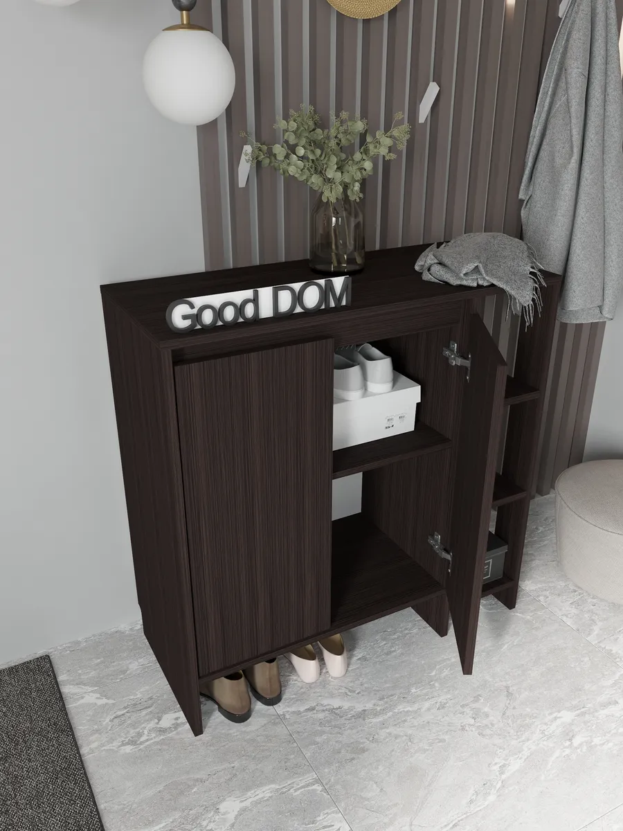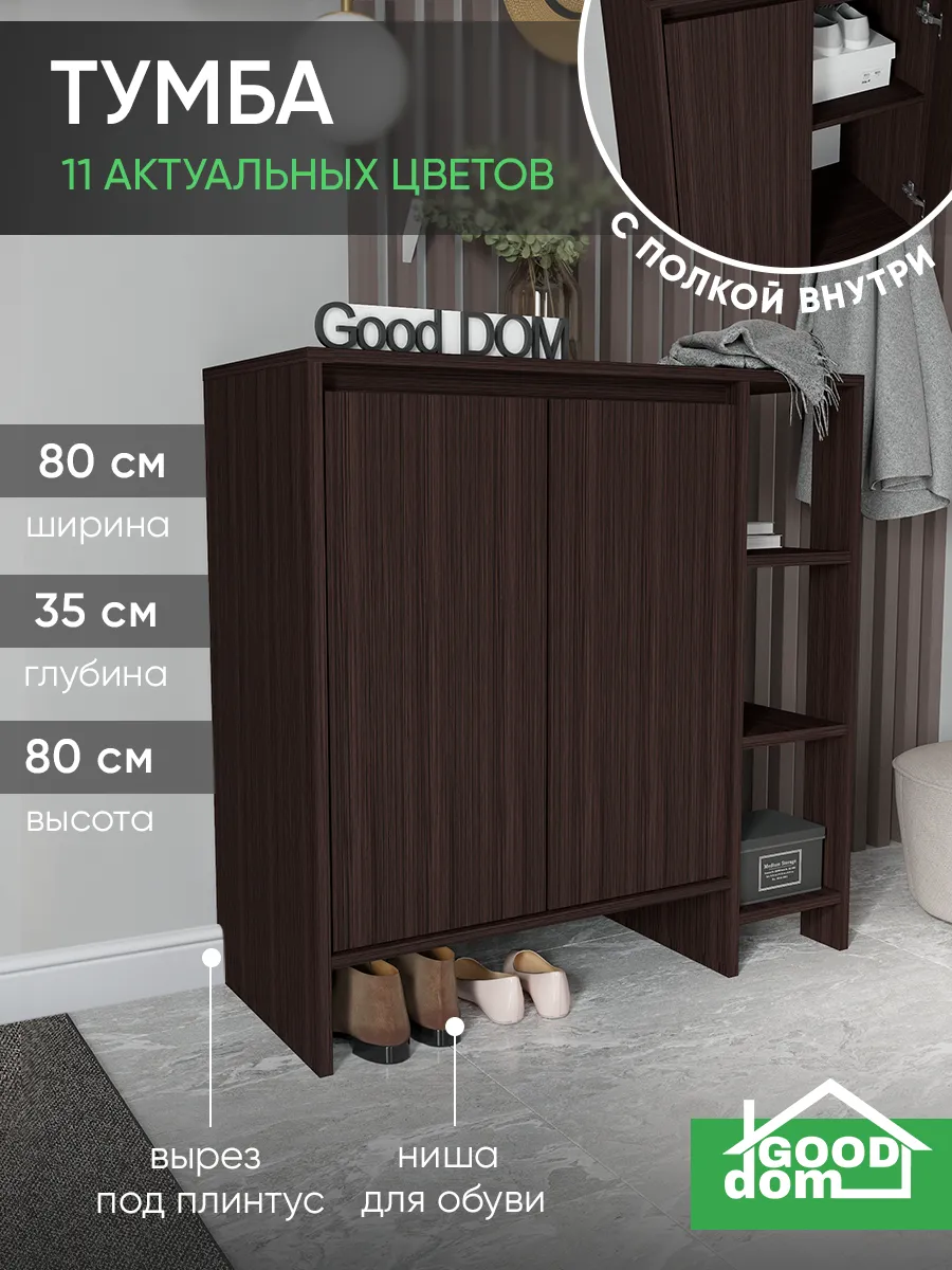 Деревянная тумба в оттенке венге — практичное решение для аккуратного хранения. За фасадами с распашными дверцами предусмотрено место для вещей, а открытая секция с полками удобна для повседневных мелочей и декора. Модель высокая, при этом узкая по глубине и визуально маленькая, но одновременно большая по вместимости: сверху широкая столешница, снизу — ниша для обуви и вырез под плинтус, чтобы изделие плотно встало у стены. По задумке дизайна это и настенная по виду композиция, и устойчивая конструкция, которая гармонично смотрится в стиле лофт.
