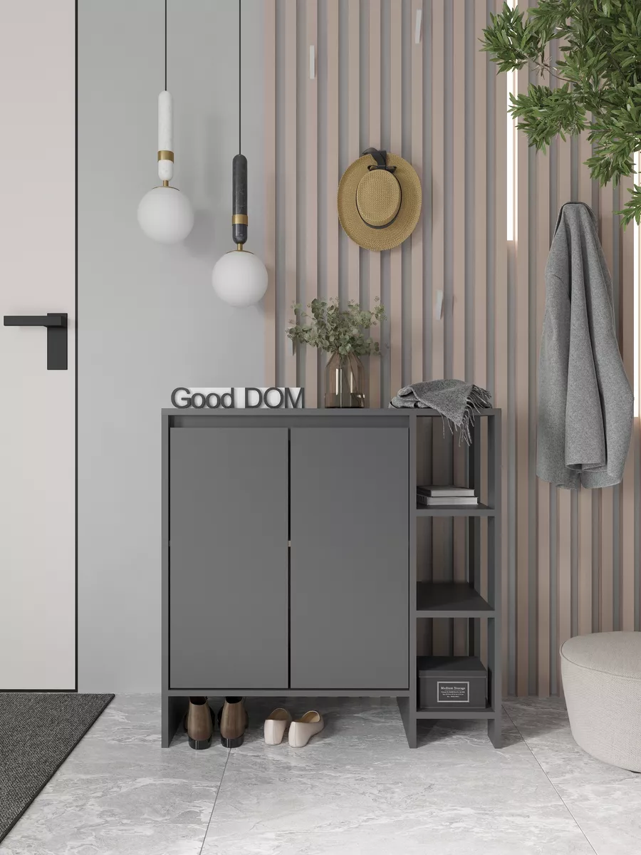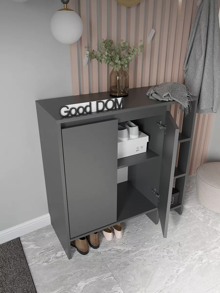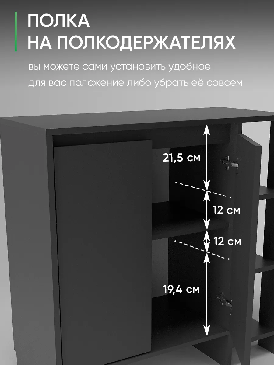Фасады с распашными дверцами скрывают внутреннее отделение с полкой, а боковой стеллаж с открытой полкой помогает держать под рукой мелочи и декор. Конструкция хорошо подходит для аккуратного размещения вещей, одежды и белья, поддерживая порядок в любой из комнаты.
