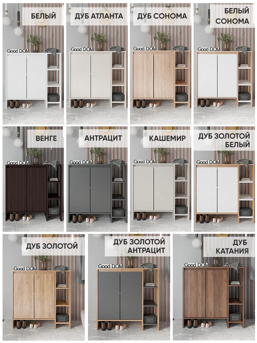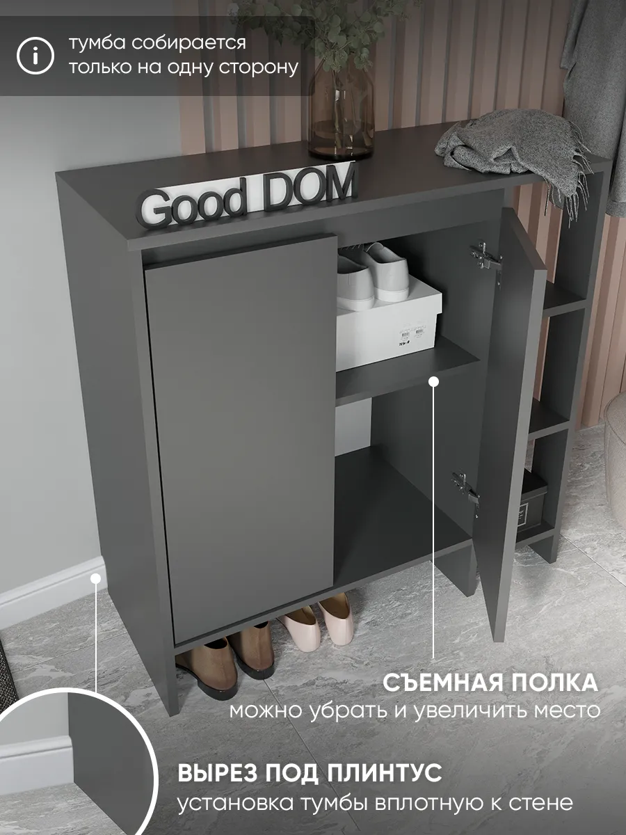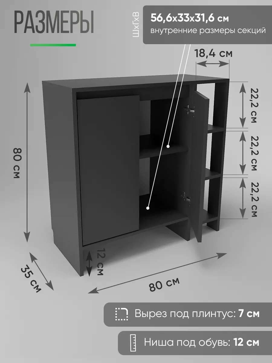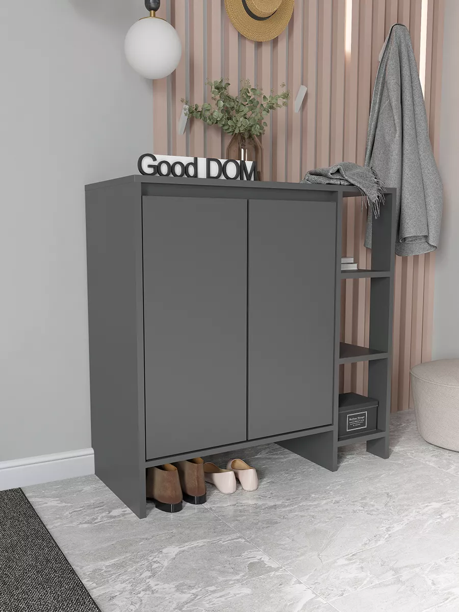 Фасады с распашными дверцами скрывают внутреннее отделение с полкой, а боковой стеллаж с открытой полкой помогает держать под рукой мелочи и декор. Конструкция хорошо подходит для аккуратного размещения вещей, одежды и белья, поддерживая порядок в любой из комнаты.