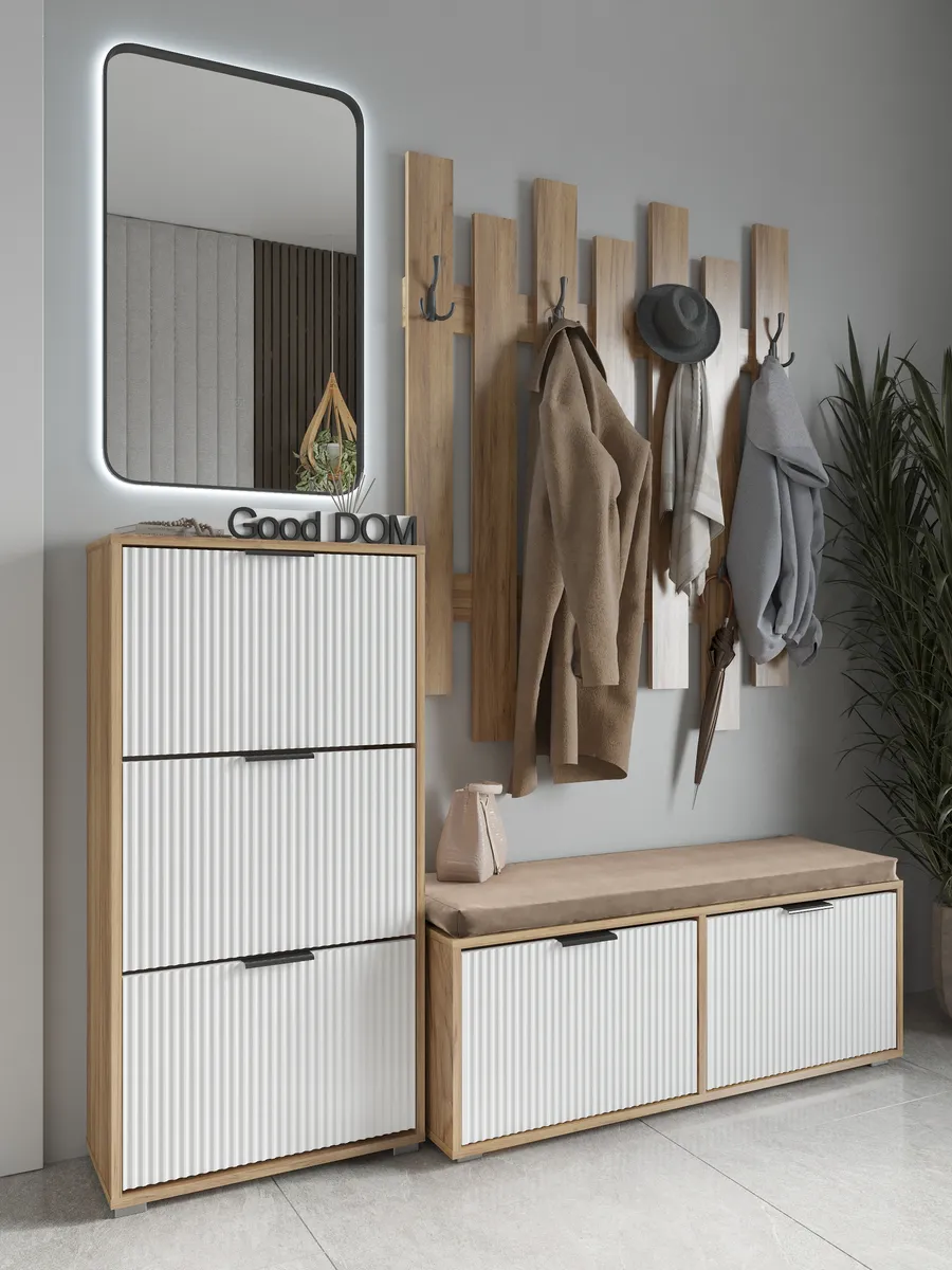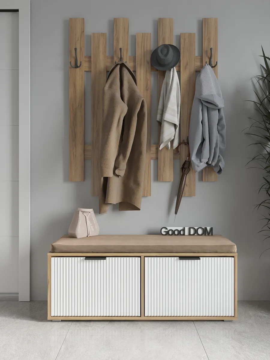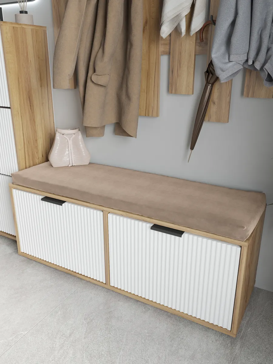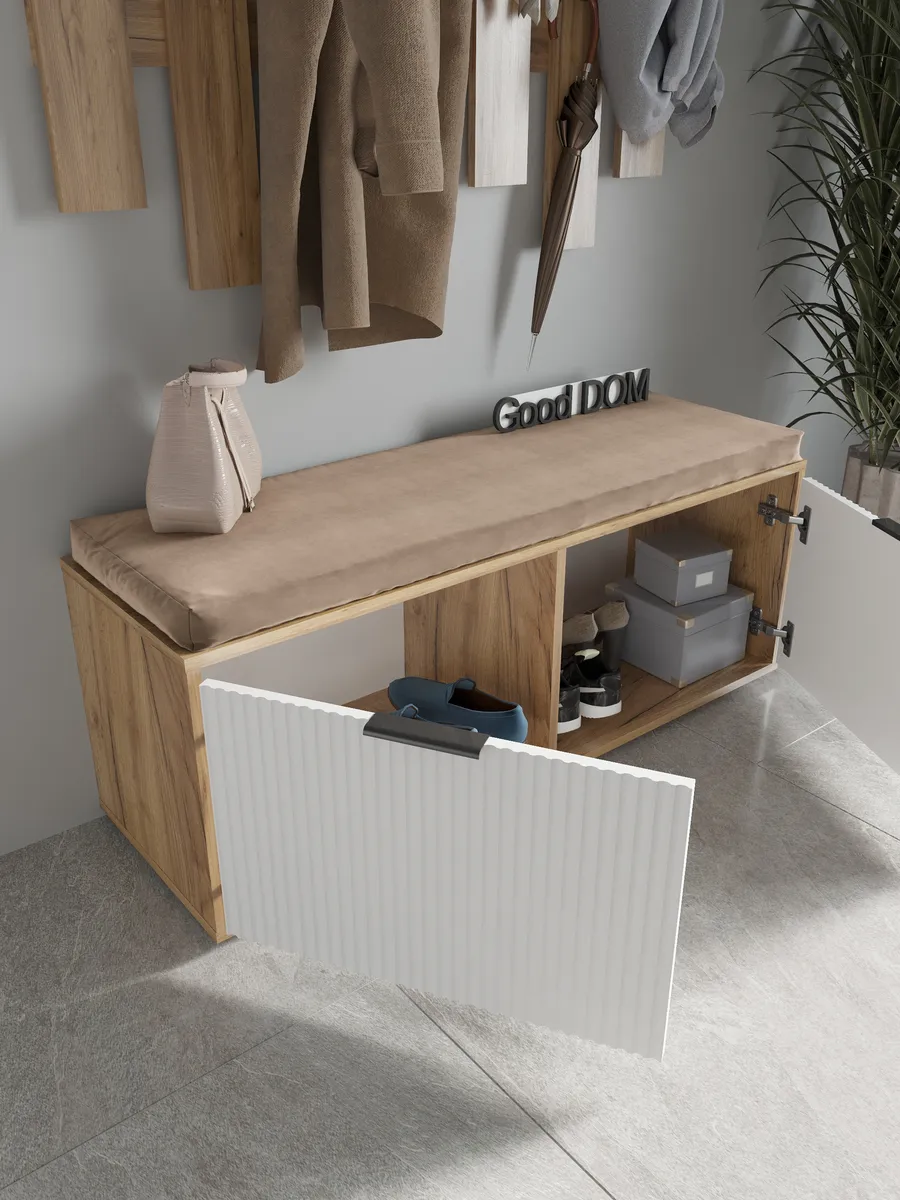 Универсальный деревянный сундук с откидным сиденьем идеально впишется в интерьер коридора или балкона, обеспечивая удобное хранение одежды, обуви и других вещей. Напольная тумбочка выполнена из натурального дуба с лисповой отделкой, что придает изделию стиль лофт и подчеркивает природную красоту дерева. Закрытый ящик с дверцей и двумя отделениями позволяет организовать пространство для постельного белья, детских игрушек или белья, сохраняя порядок в доме. Мягкая сидушка с золотистой отделкой создает комфортное место для сидения при переодевании, а широкая ножка обеспечивает устойчивость конструкции. Этот большой сундук с удобной дверью станет отличным дополнением спальни, зала или коридора, сочетая в себе функциональность и эстетичный дизайн. Цветовая гамма включает коричневый и белый оттенки, что позволяет легко вписать изделие в различные стилистические решения. Топчан с крафтовой пленкой защищает поверхность от повреждений, а угловая конструкция экономит пространство в комнате.