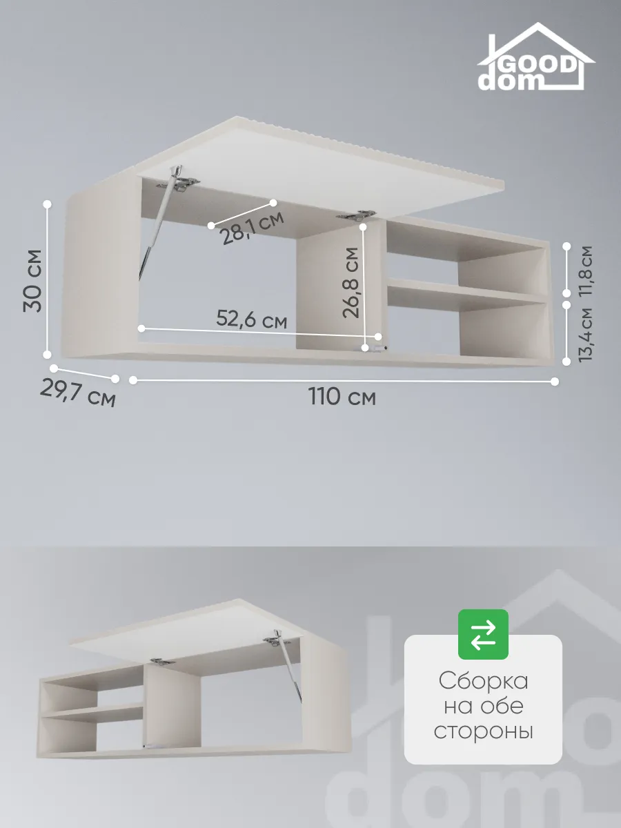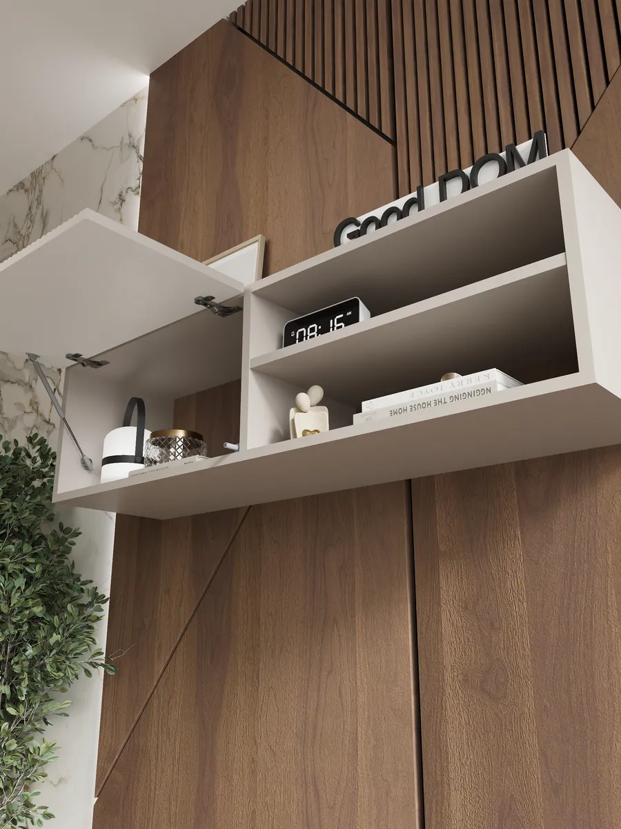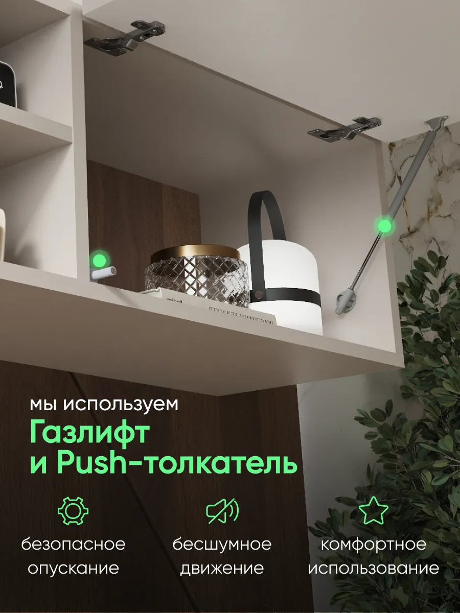 Фасад открывается вниз, установлен газлифт с регулировкой угла открытия для плавного и безопасного поднятия. Система push-to-open (пуш-толкатель) обеспечивает открывание нажатием без ручек, сохраняя минималистичный внешний вид.