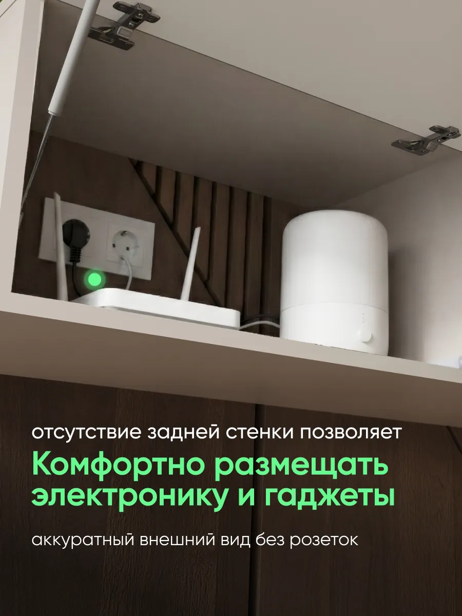 Открытая ниша подходит для техники, которой требуется доступ к управлению и вентиляции. Полка внутри позволяет рационально организовать пространство и хранить больше вещей.