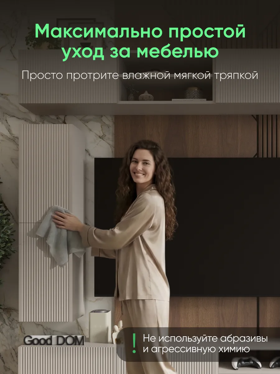 Модель сочетает закрытую секцию с фасадом из МДФ с декоративной фрезеровкой и открытую нишу с полкой. Такое решение удобно для хранения и размещения техники. Внутри легко помещаются игровые приставки (PlayStation, Xbox), ТВ-приставка, роутер, саундбар, медиаплеер, документы и аксессуары.