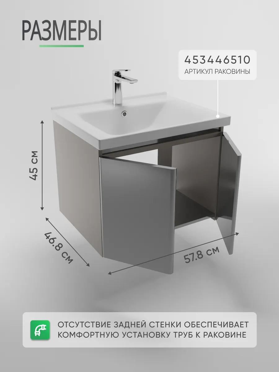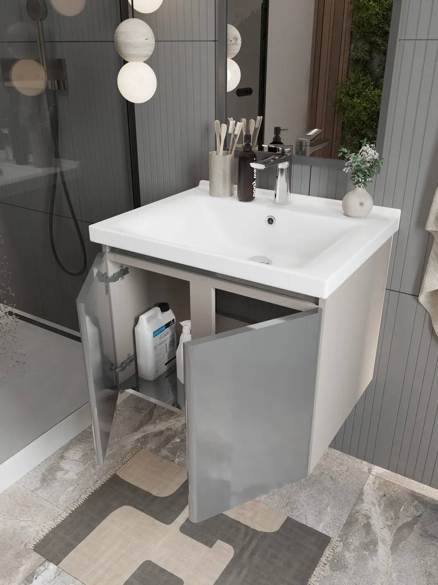 Полная влагостойкость тумбы под раковину — не деформируется и не разбухает со временем. Срок службы до 15 лет — без потери внешнего вида и функциональности. Качественная керамическая раковина — прочная, легко очищается, не боится царапин. Мягкое закрытие — дверцы на доводчиках для комфортного и бесшумного использования. Надёжные крепления — усиленные монтажные пластины специально разработаны под материал. Лаконичный дизайн тумбы — подходит для современных и классических интерьеров. Подвесная конструкция — облегчает уборку, визуально расширяет пространство.