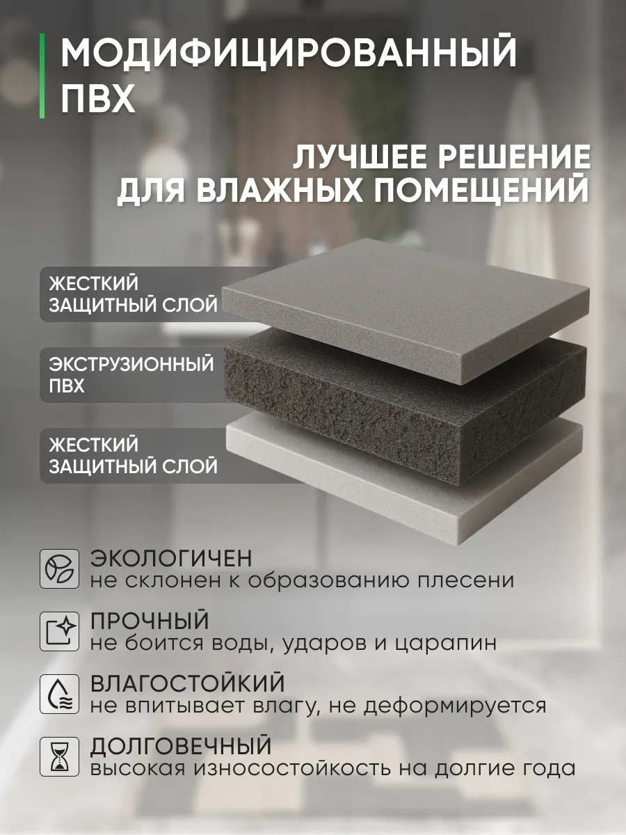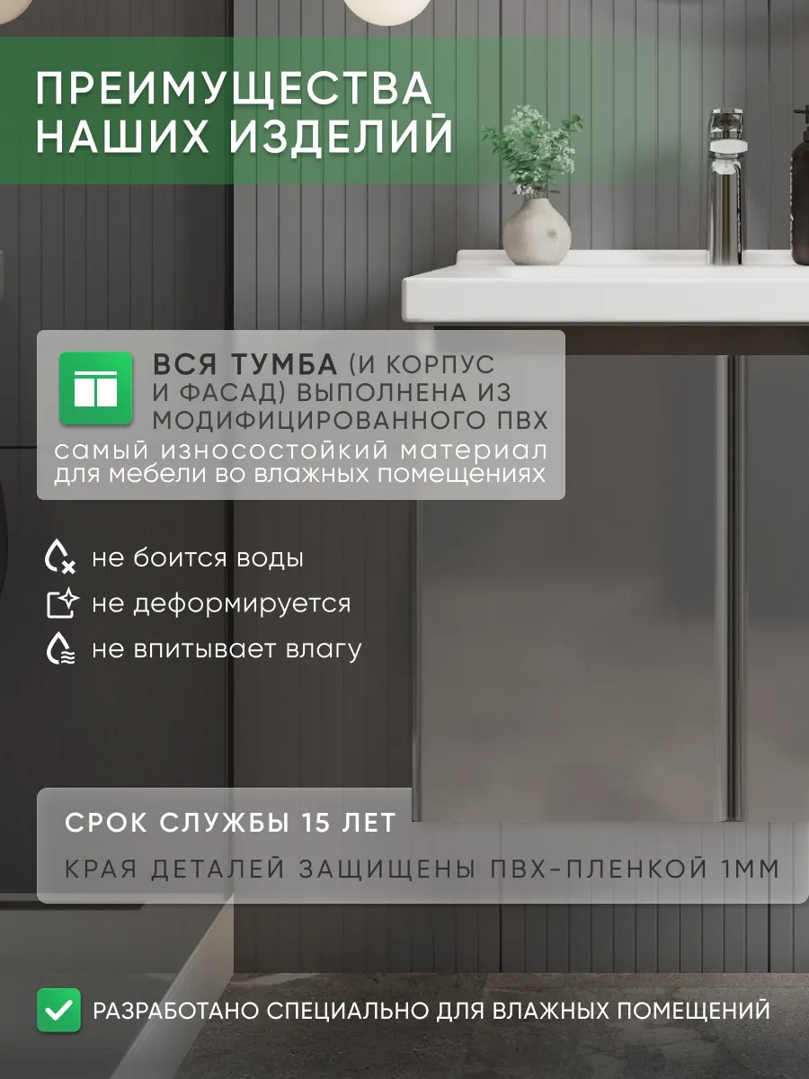 Корпус изготовлен из модифицированного ПВХ и облицован влагостойкой ПВХ-плёнкой толщиной 1 мм. Этот материал устойчив к влаге, пару и перепадам температуры, что делает тумбу максимально надёжной и долговечной.