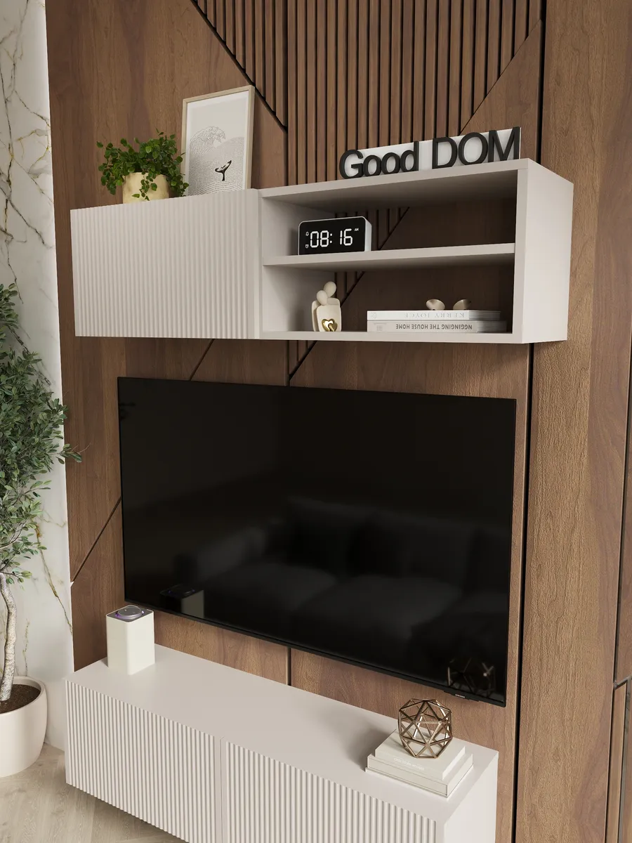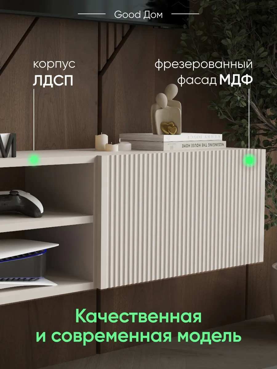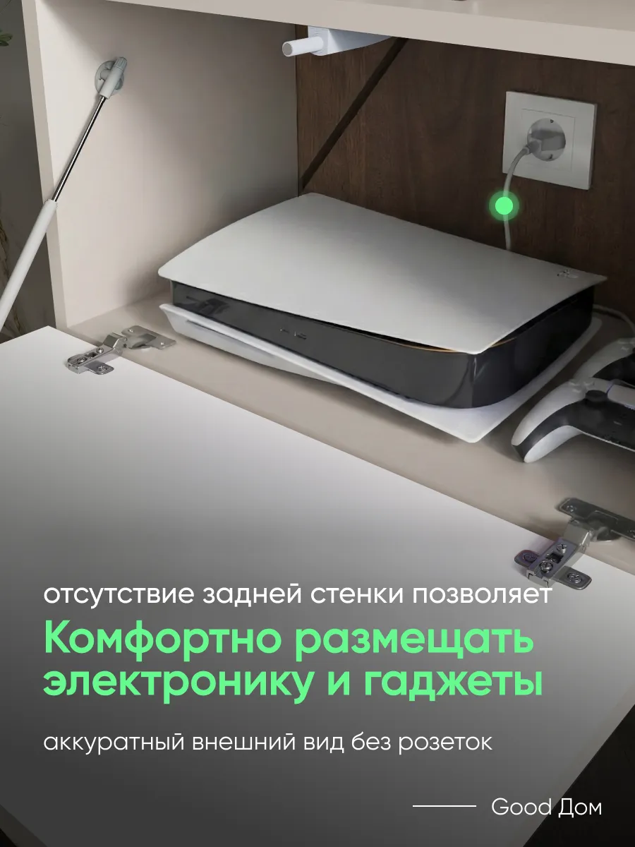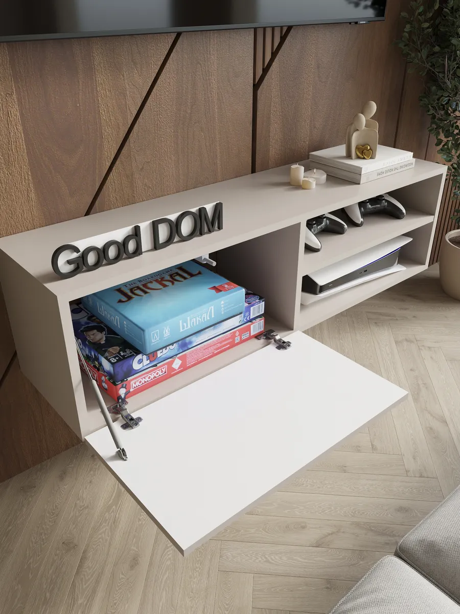 Модель сочетает закрытую секцию с фасадом из МДФ с декоративной фрезеровкой и открытую нишу с полкой. Такое решение удобно для хранения и размещения техники. Внутри легко помещаются игровые приставки (PlayStation, Xbox), ТВ-приставка, роутер, саундбар, медиаплеер, документы и аксессуары.