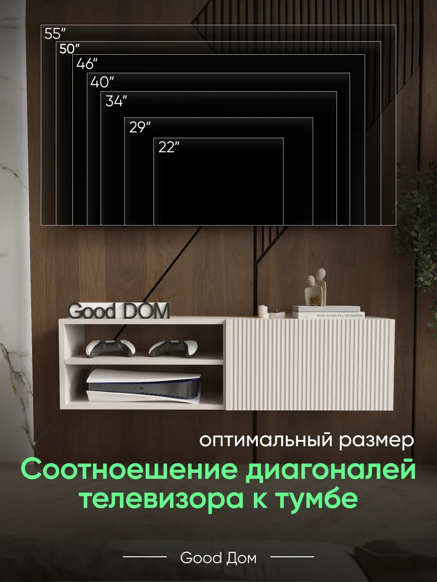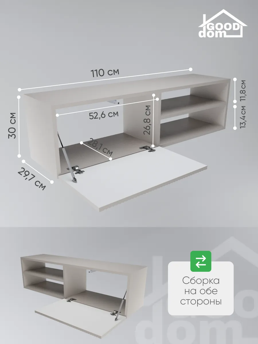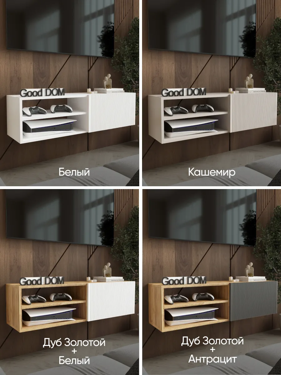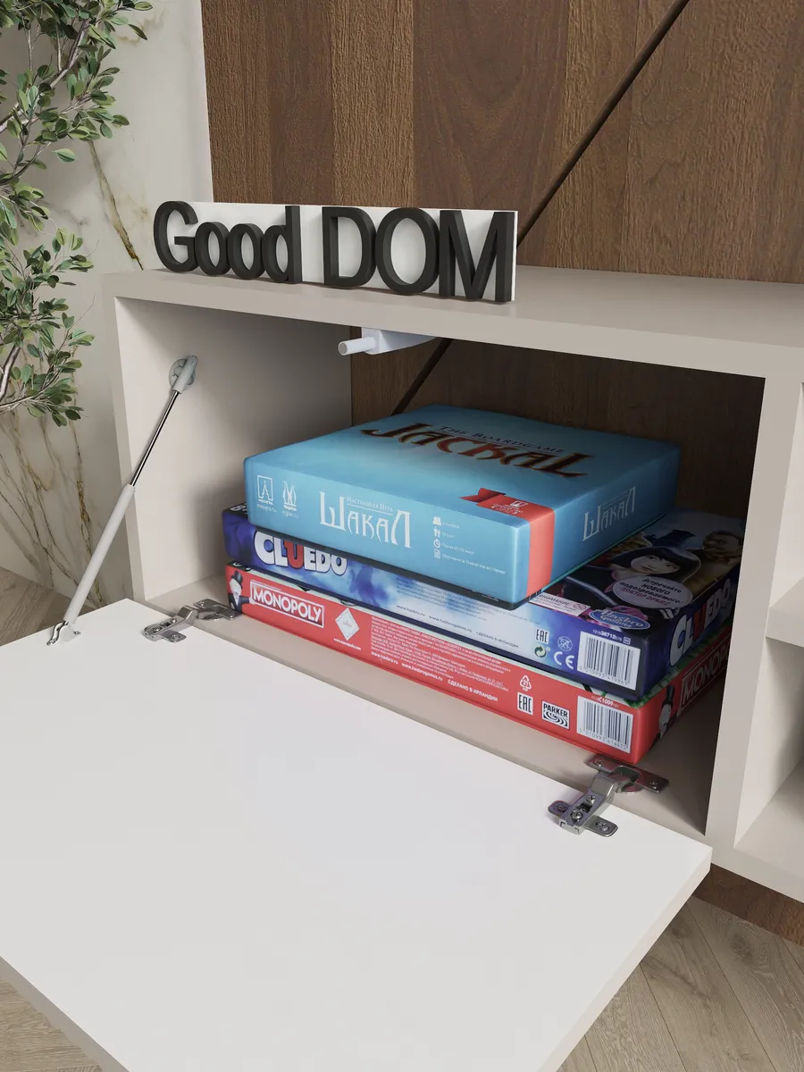 Модель сочетает закрытую секцию с фасадом из МДФ с декоративной фрезеровкой и открытую нишу с полкой. Такое решение удобно для хранения и размещения техники. Внутри легко помещаются игровые приставки (PlayStation, Xbox), ТВ-приставка, роутер, саундбар, медиаплеер, документы и аксессуары.