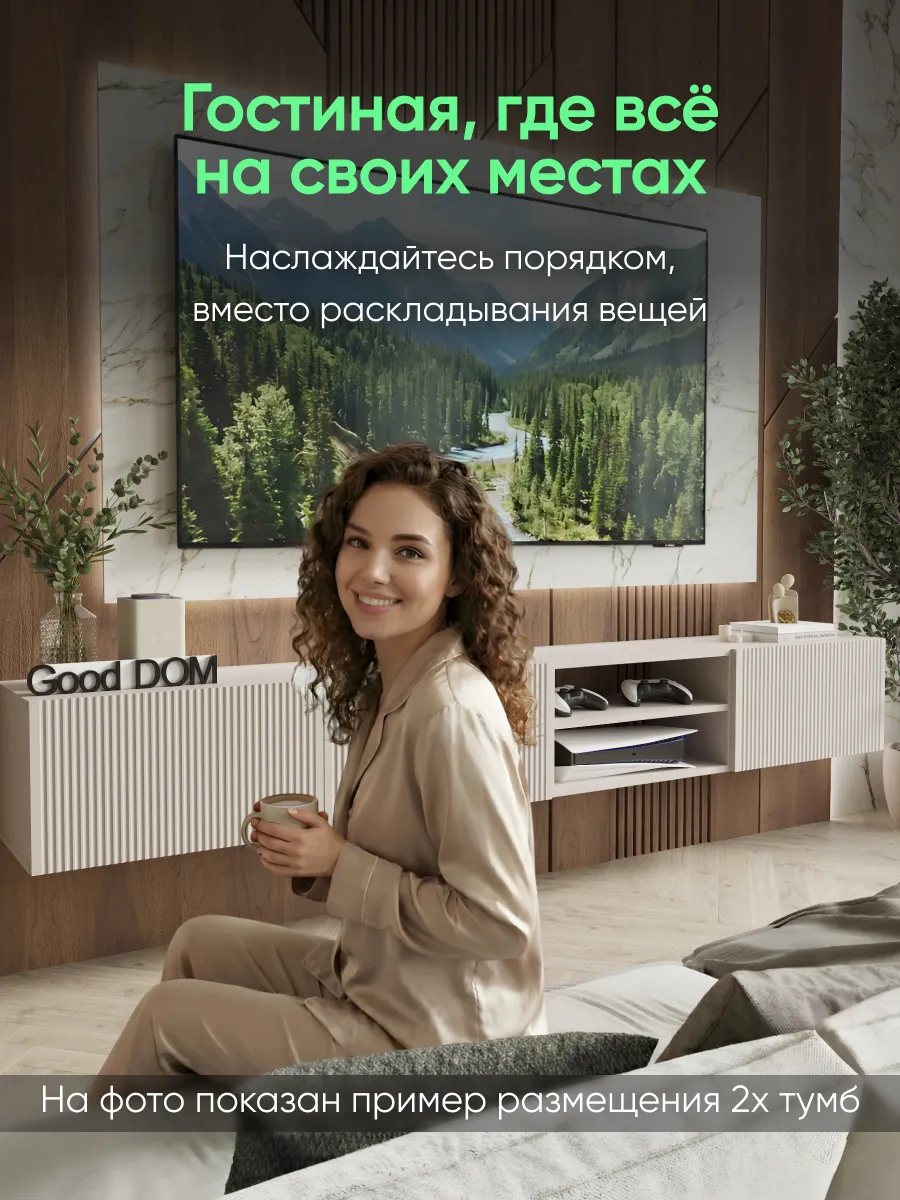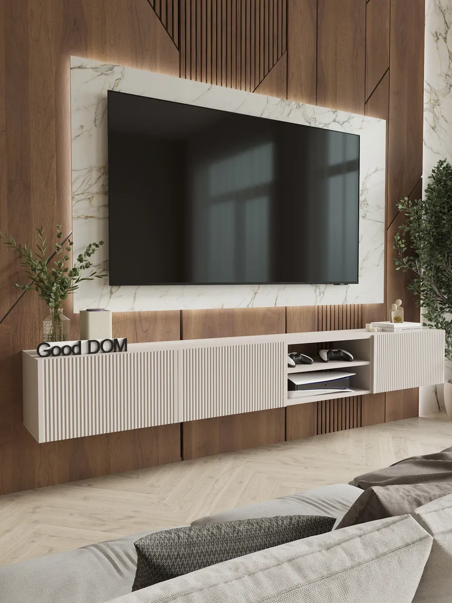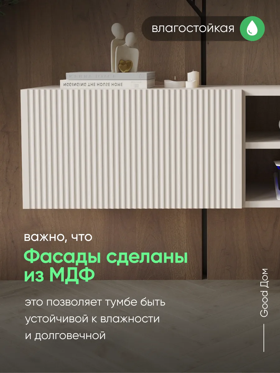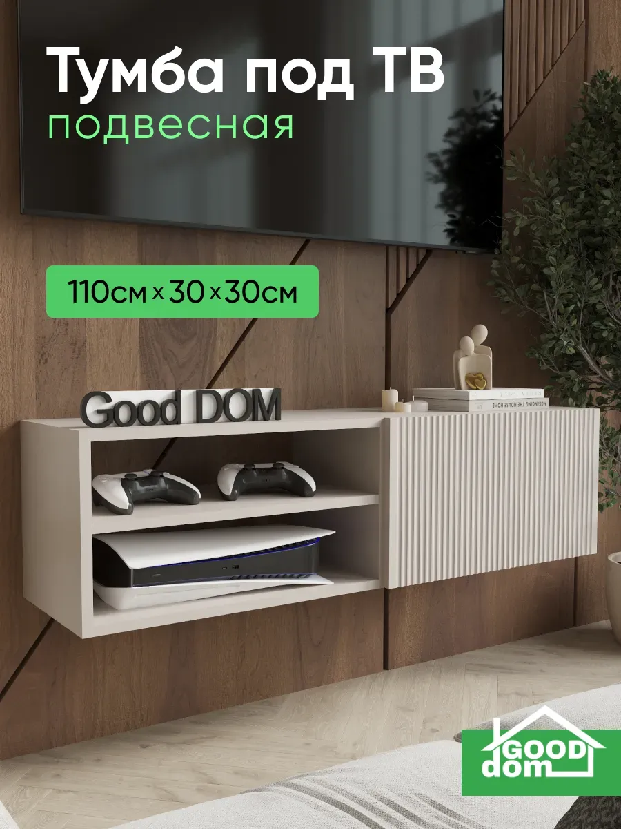 Подвесная тумба под телевизор с фрезерованным фасадом МДФ — стильное и функциональное решение для современного интерьера. Размер 1100×297×300 мм позволяет разместить тумбу под ТВ в гостиной, спальне, кабинете или детской комнате.