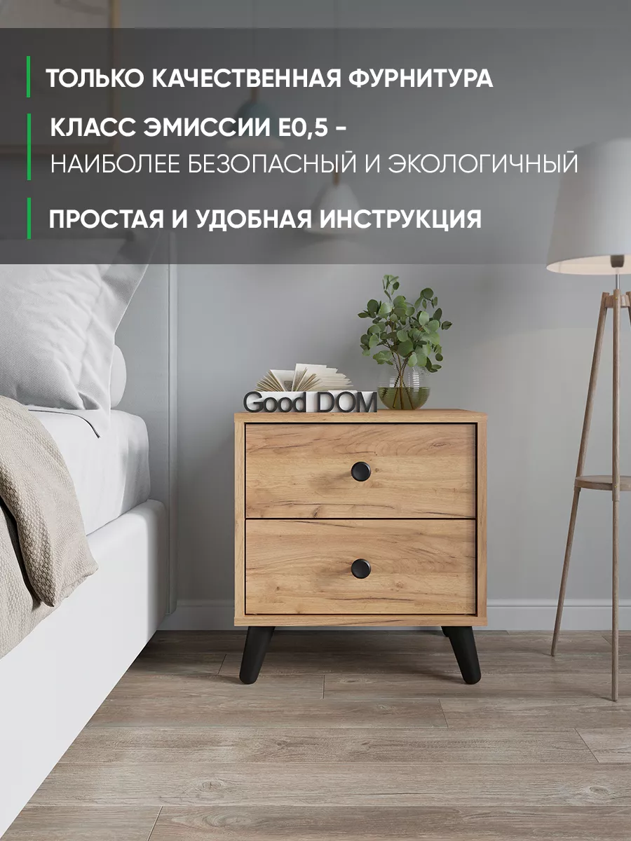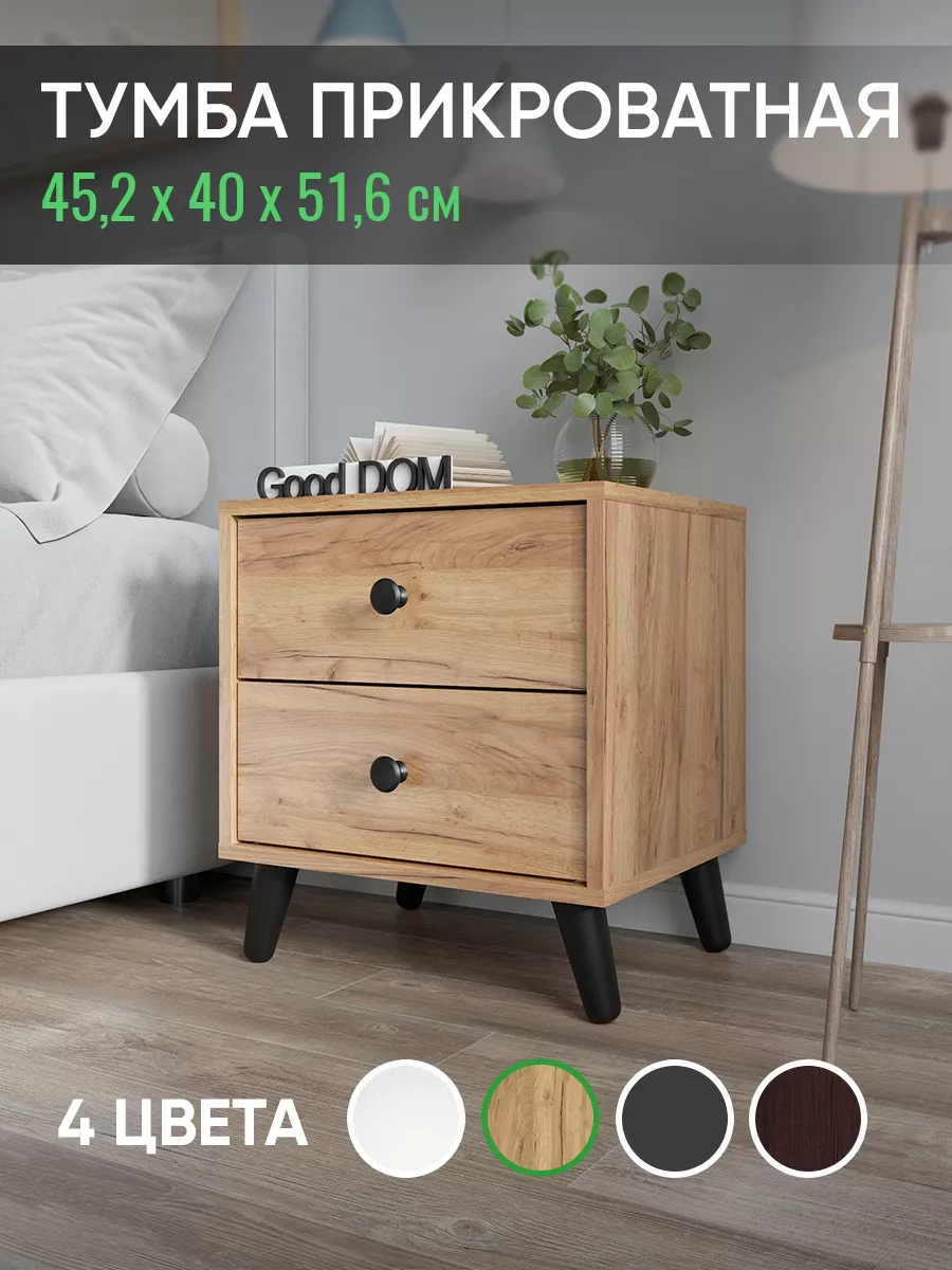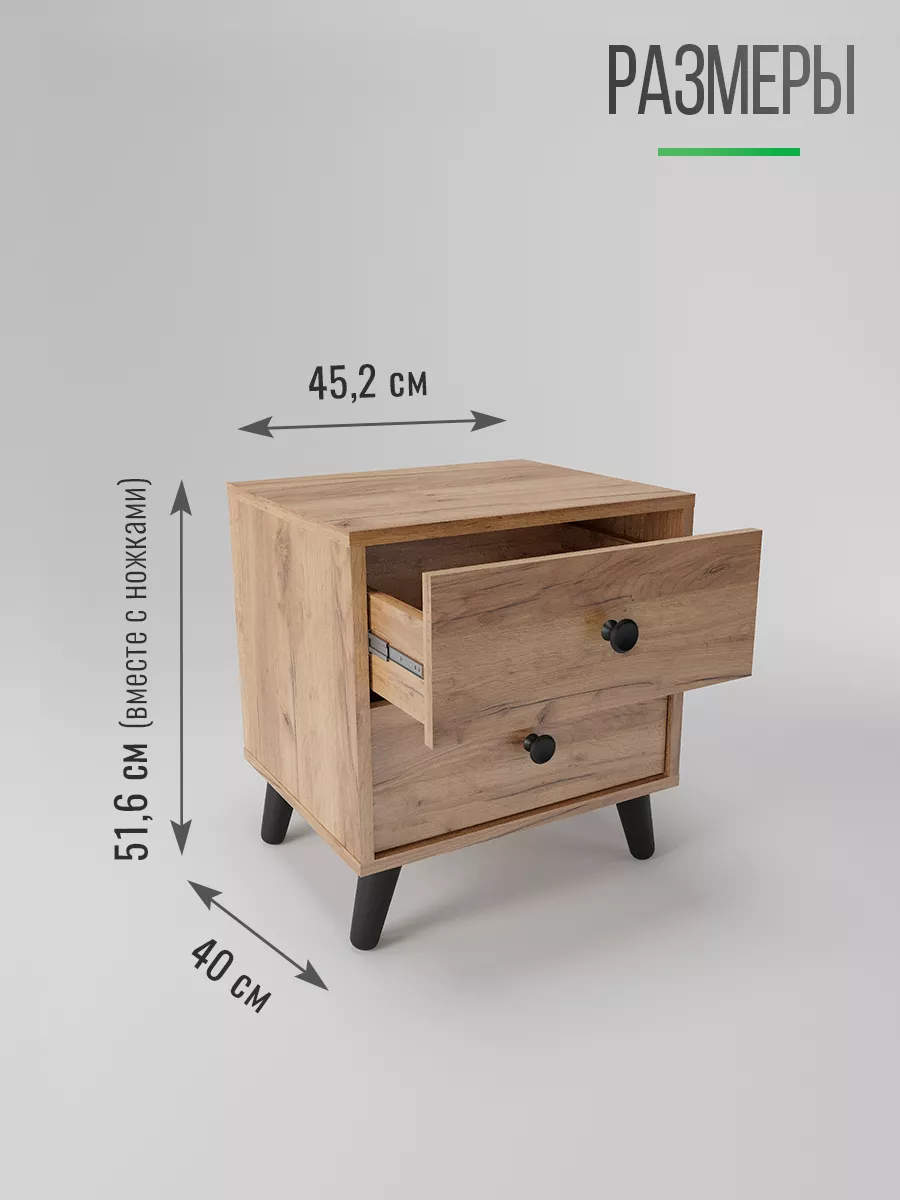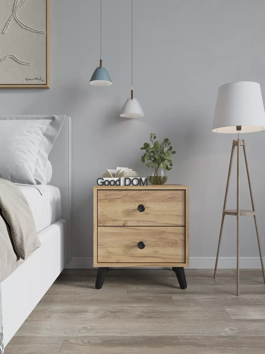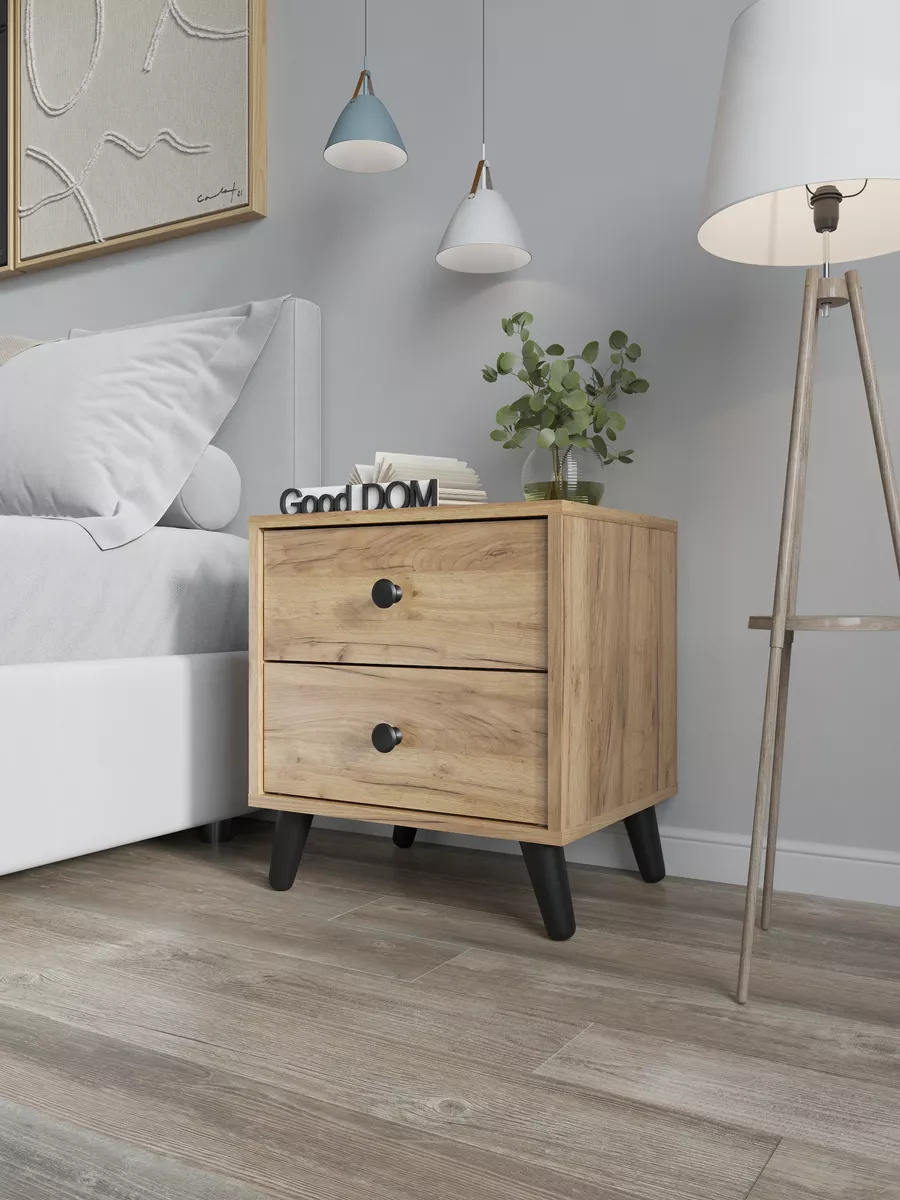 Тумба прикроватная напольная - это идеальное решение для небольшой комнаты. Прикроватная тумбочка в современном дизайне на стильных деревянных ножках и черной ручкой-кнопкой. Тумбочка напольная поможет грамонтно организовать пространство у кровати и разместить необходимые вам вещи: книги, телефон или планшет, зарядные устройства и другие мелочи. Тумба с двумя выдвижными ящиками не съедает пространство и подойдет так же для узких коридоров как тумба в прихожую. Тумбочка напольная также может служить как столик для напитков, а в детской комнате может использоваться как консольный столик. Тумбочка в прихожую, благодаря ящикам, сможет заменить вам большую обувницу в малогабаритной квартире.