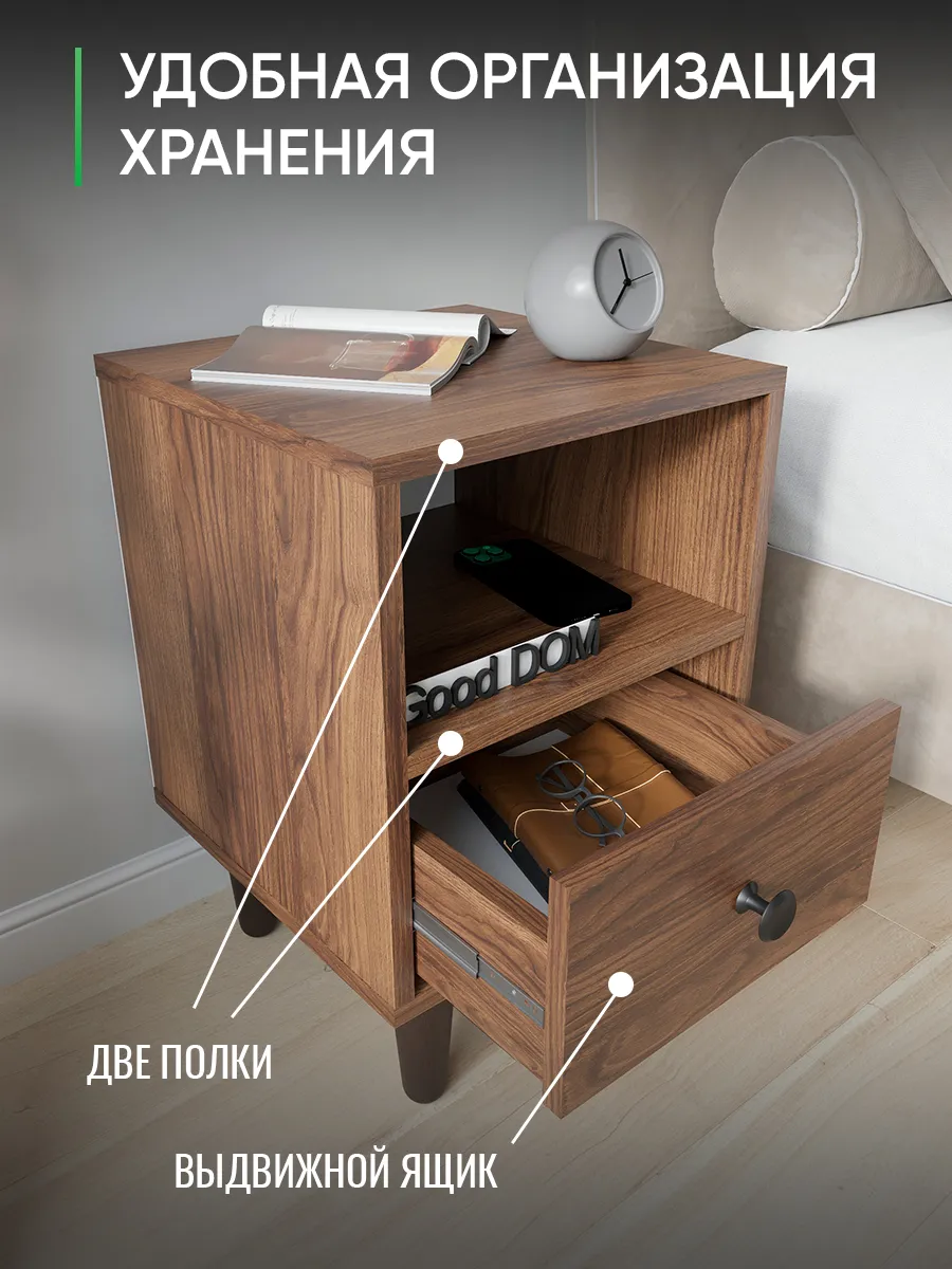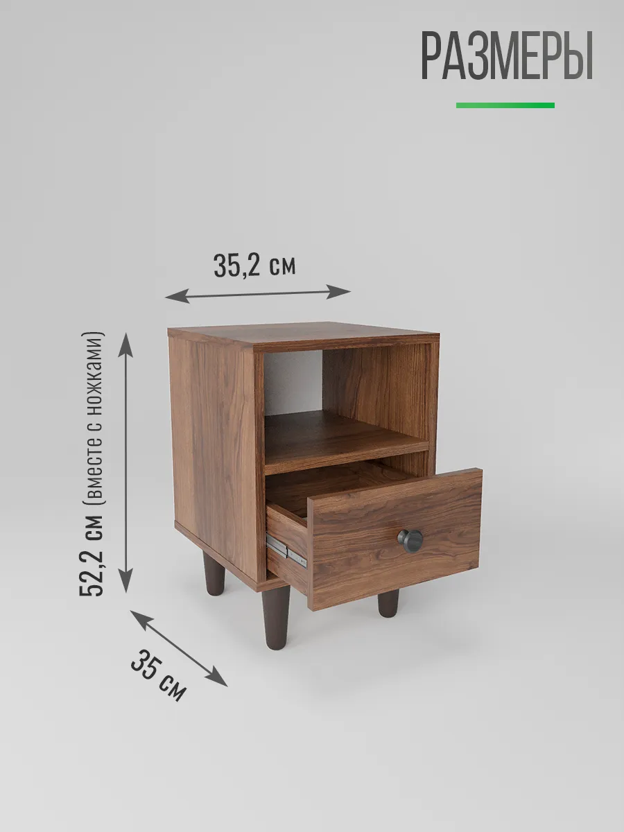 Тумба на ножках также может расположиться даже в гараже для небольших инструментов. Стильная тумба в офис дополнит интерьер приемной или кабинета. Ее можно использовать как подставку под принтер. Столик прикроватный для завтрака или кофе. Компактная тумбочка подойдет для хранения косметики и детских вещей. Современный дизайн тумбы - отличный выбор для тех, кто ценит минимализм и стиль лофт loft, а деревянные ножки и стильная ручка-кнопка в черном цвете поможет создать дизайн интерьера в стиле сканди. Можно с легкостью использовать ее как тумба под маленький телевизор ТВ или ноутбук, а так же как туалетный столик или макияжный, для девочки под зеркало. Подойдет любой квартире в гардеробную в виде приставной тумбочки или например подставка или полка для цветов, фотографий, телефона, книг или роутера.Маленький комод для детской поможет не растерять мелкие игрушки и любимые книги.
