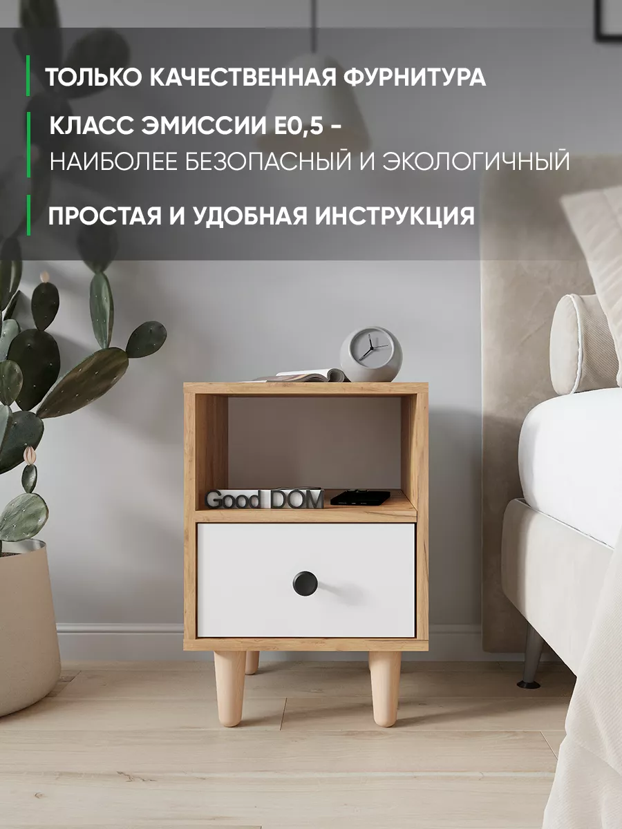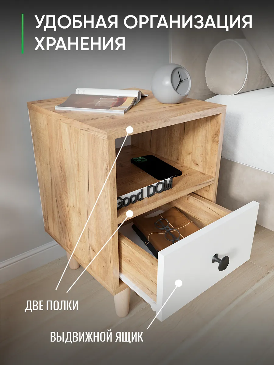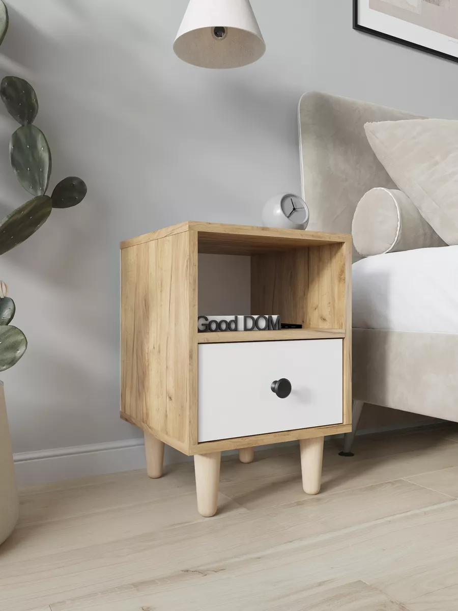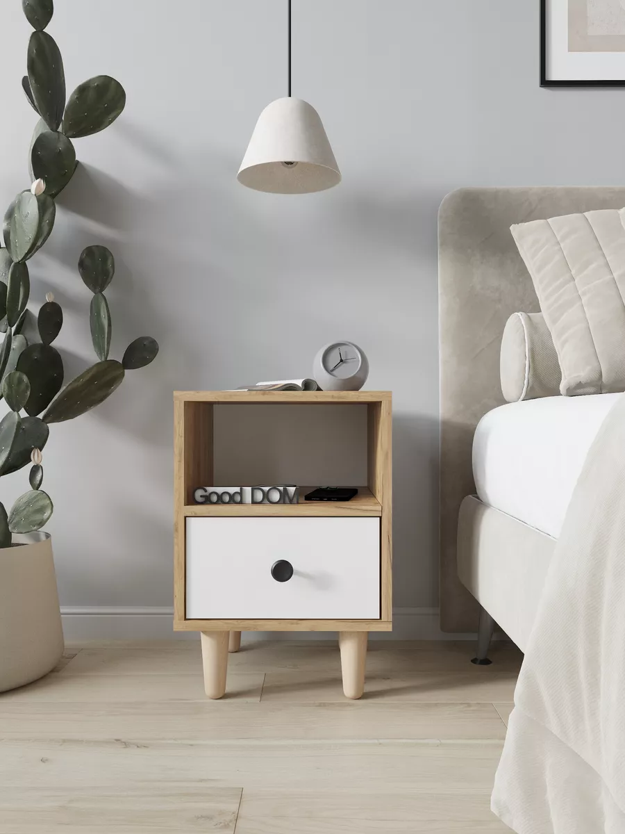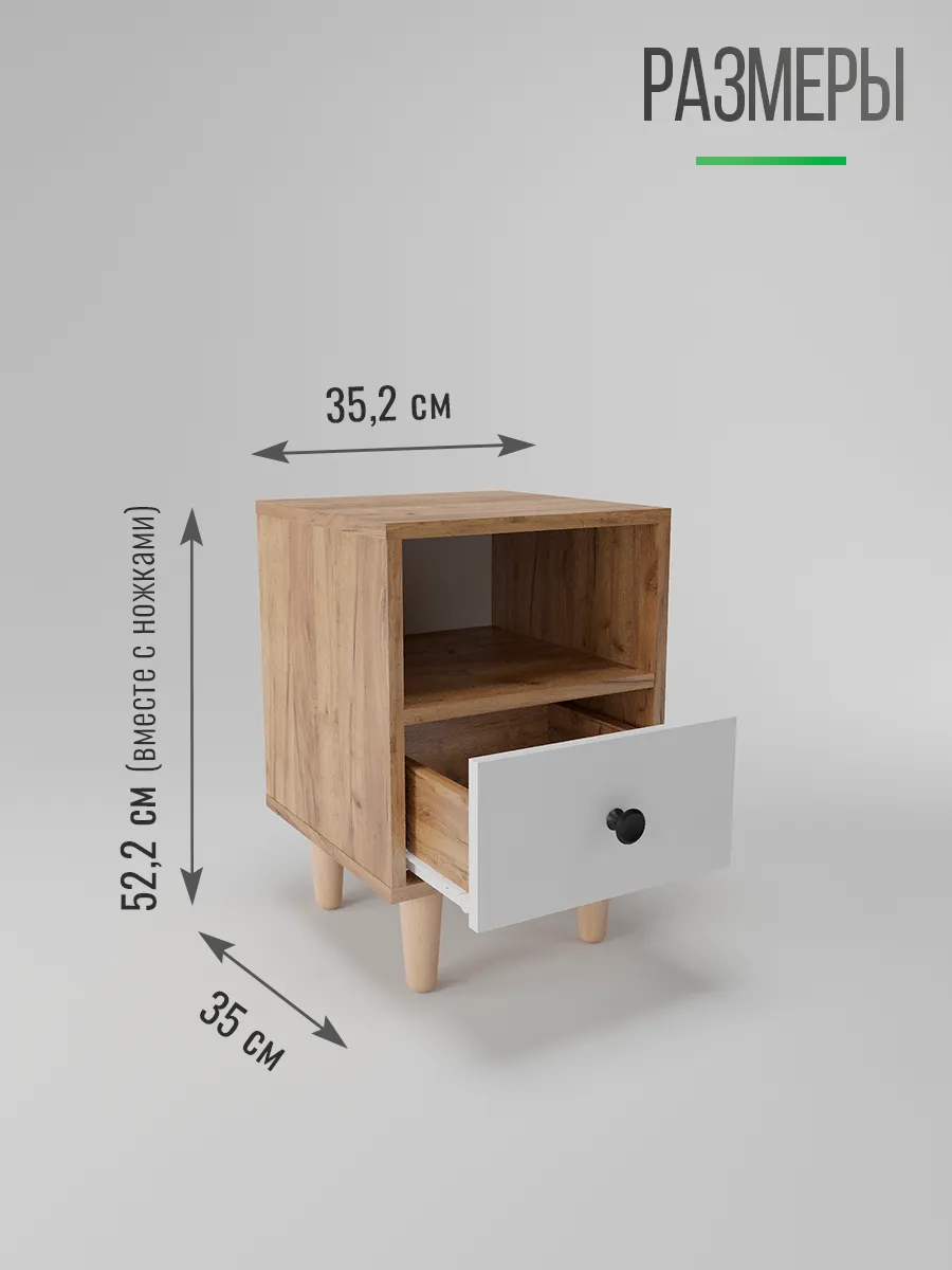 Тумба на ножках также может расположиться даже в гараже для небольших инструментов. Стильная тумба в офис дополнит интерьер приемной или кабинета. Ее можно использовать как подставку под принтер. Столик прикроватный для завтрака или кофе. Компактная тумбочка подойдет для хранения косметики и детских вещей. Современный дизайн тумбы - отличный выбор для тех, кто ценит минимализм и стиль лофт loft, а деревянные ножки и стильная ручка-кнопка в черном цвете поможет создать дизайн интерьера в стиле сканди. Можно с легкостью использовать ее как тумба под маленький телевизор ТВ или ноутбук, а так же как туалетный столик или макияжный, для девочки под зеркало. Подойдет любой квартире в гардеробную в виде приставной тумбочки или например подставка или полка для цветов, фотографий, телефона, книг или роутера.Маленький комод для детской поможет не растерять мелкие игрушки и любимые книги.