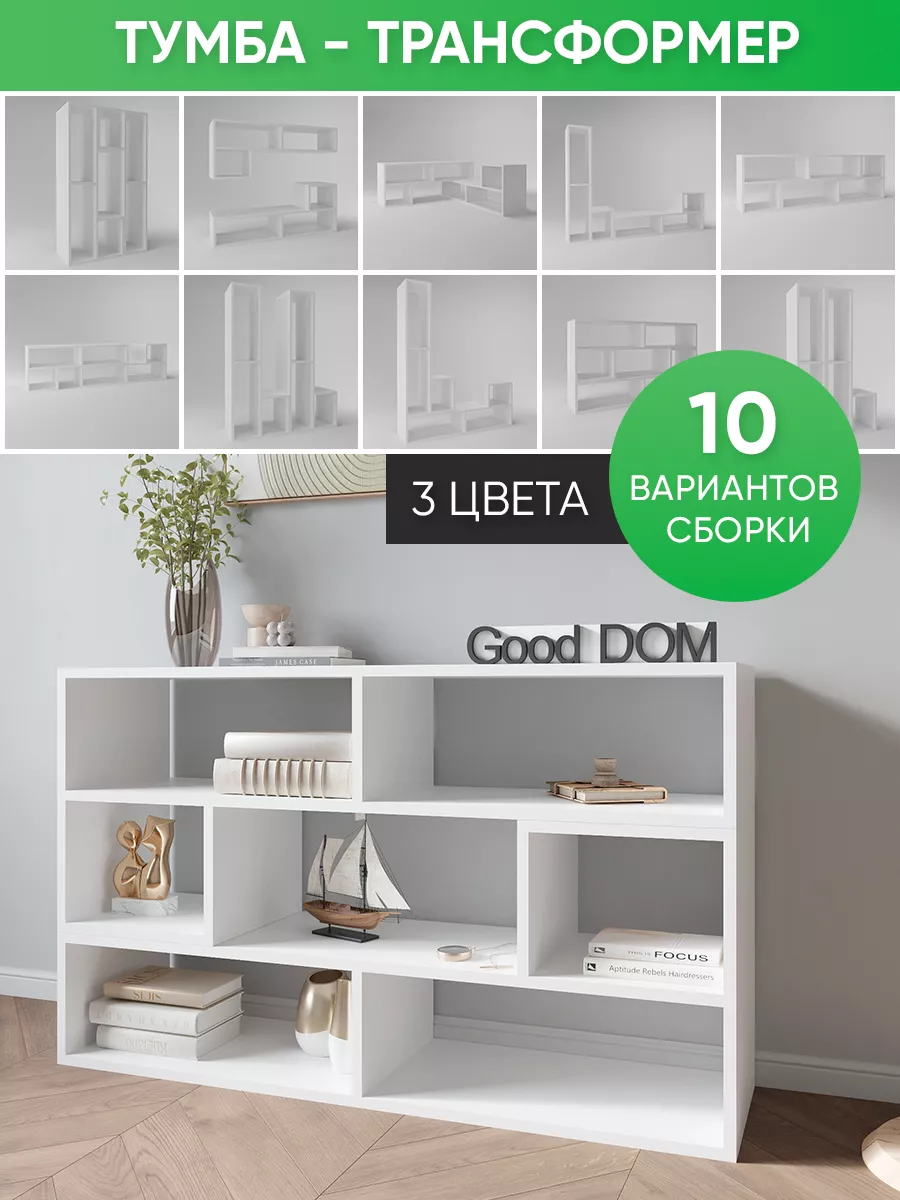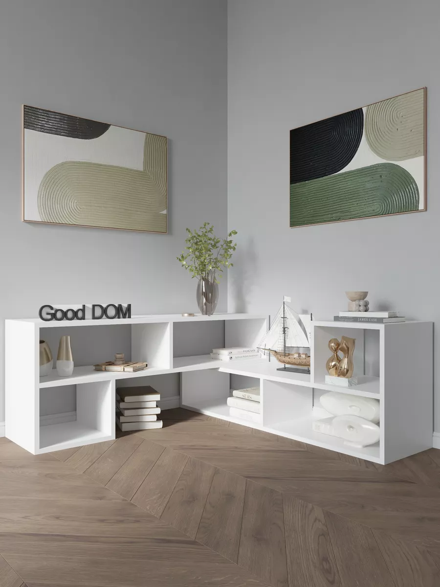 Тумба «Хамелеон» представляет собой тумбу-трансформер, которая по вашему желанию может быть тумбой, стеллажом, полкой напольной или настенной! 10 вариантов сборки позволяют разместить тумбу именно так, как нужно вам. Универсальная напольная полка может быть расположена в любой комнате. В гостиной на тумбе можно расположить гаджеты, книги, растения и цветы, предметы декора. Есть вариант расположения как тумба под тв. В тумбе под телевизор можно расположить все зарядки, провода, пульты управления и прочие нужные аксессуары к ТВ. Так же у стеллажа есть вариант углового размещения. Стеллаж компактно вписывается как полка в угол, но одновременно позволяет функционально использовать пространство. Кроме этого, есть вариант размещения вертикального стелажа, который позволит хранить высокие предметы или книги стопкой довольно компактно, но в то же время вместительно. В детской стеллаж удобно вместит множество игрушек, книг, учебников и тетрадей. Полку напольную можно расположить и в прихожей, вместо громоздкого шкафа-купе или стенки. Открытые полки стеллажа позволяют создать воздушный и необычный образ, не заставляя комнату закрытыми шкафами, съедающими пространство. Универсальная тумба-трансформер выгодно дополнит ваш интерьер, а главное поможет грамотно организовать систему хранения. Выбери свой вариант размещения!