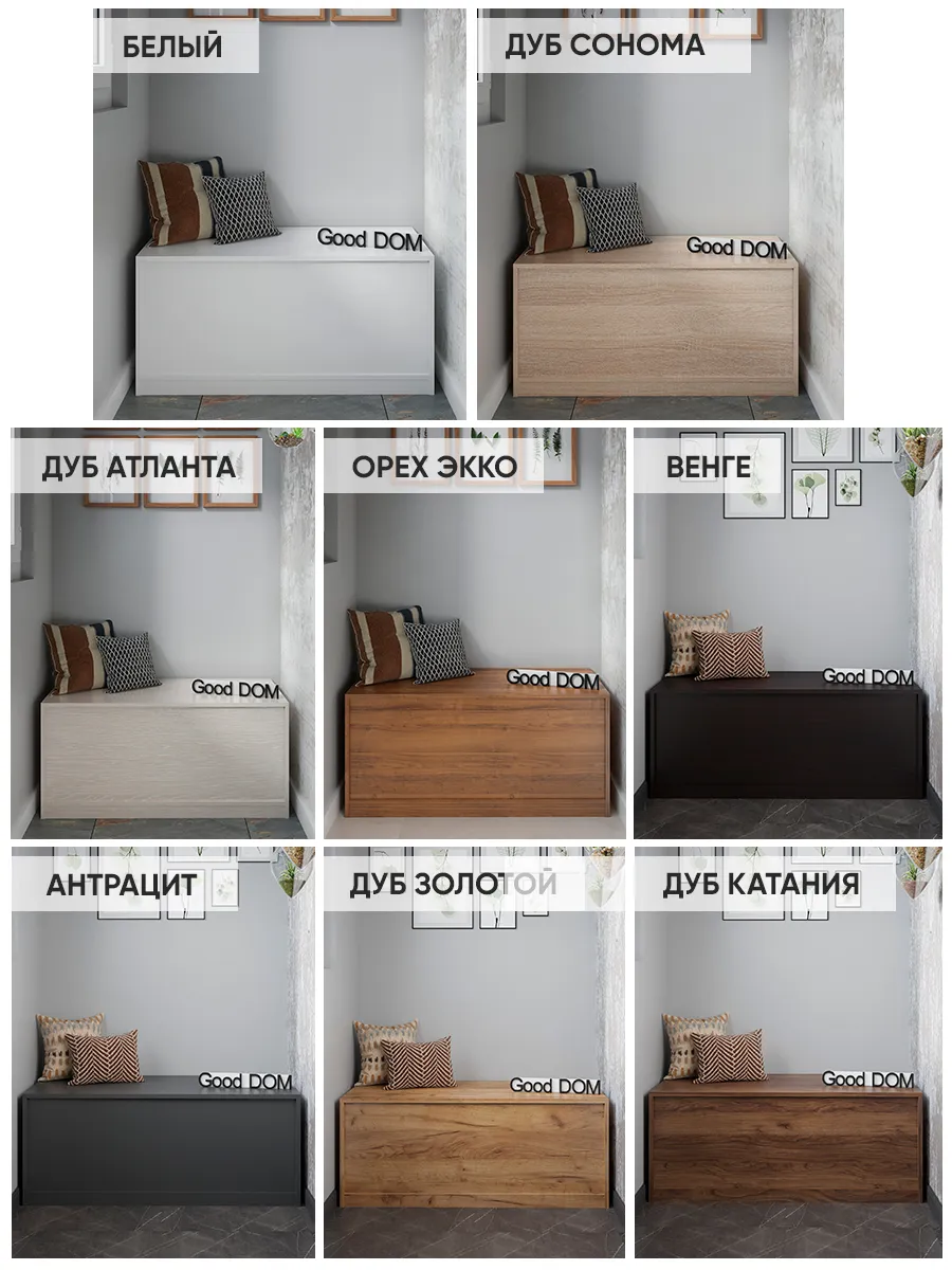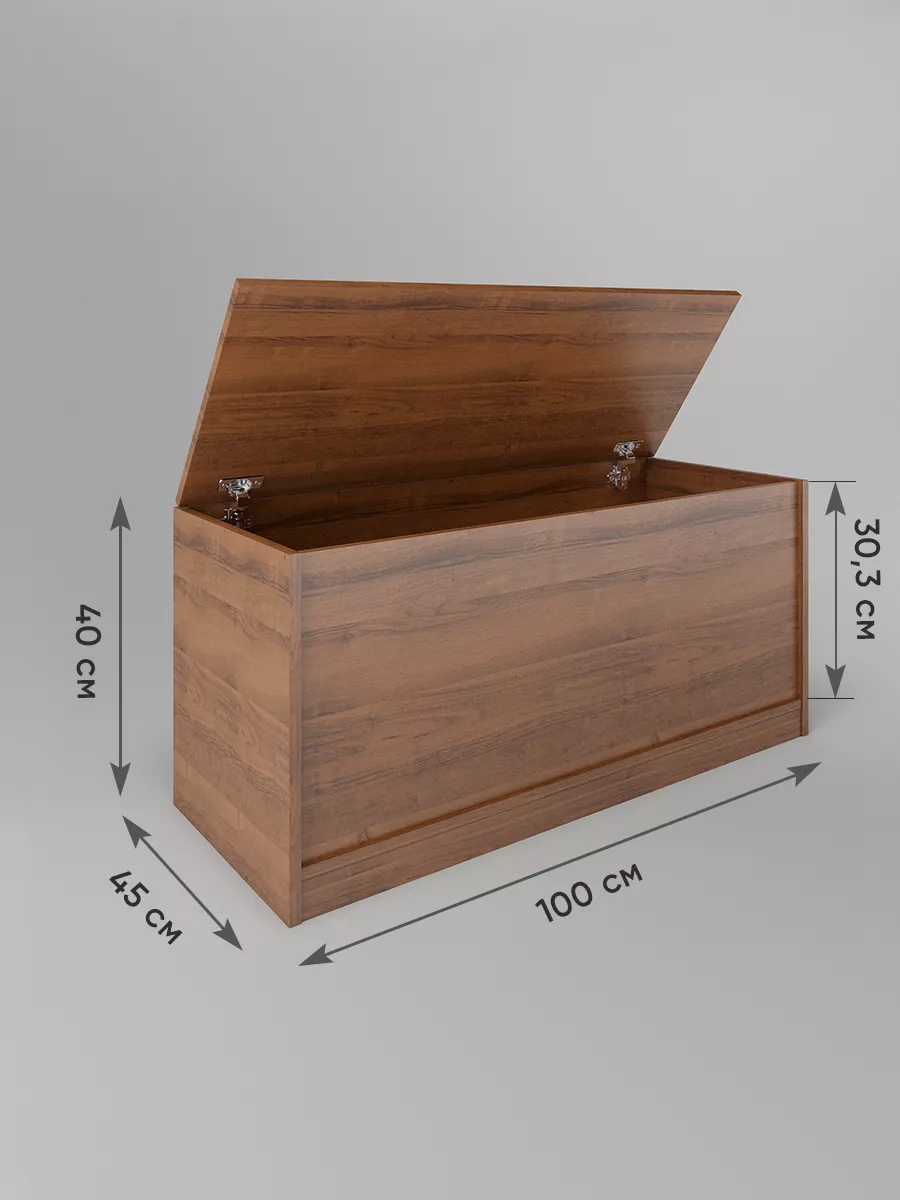 Размеры тумбы ящика с откидной крышкой: ширина 100 см, высота 40 см, глубина 45 см. Доступные цвета: белый, орех, сонома, атланта, венге, дуб золотой, антрацит, дуб катания. Можно положить сверху матрасик и этим сделать напольный диванчик на балкон или в зал, длинную тумбу с сиденьем в прихожую, диванчик для офиса, дачный диван, садовая мебель - своего рода топчан для отдыха в любом помещении.