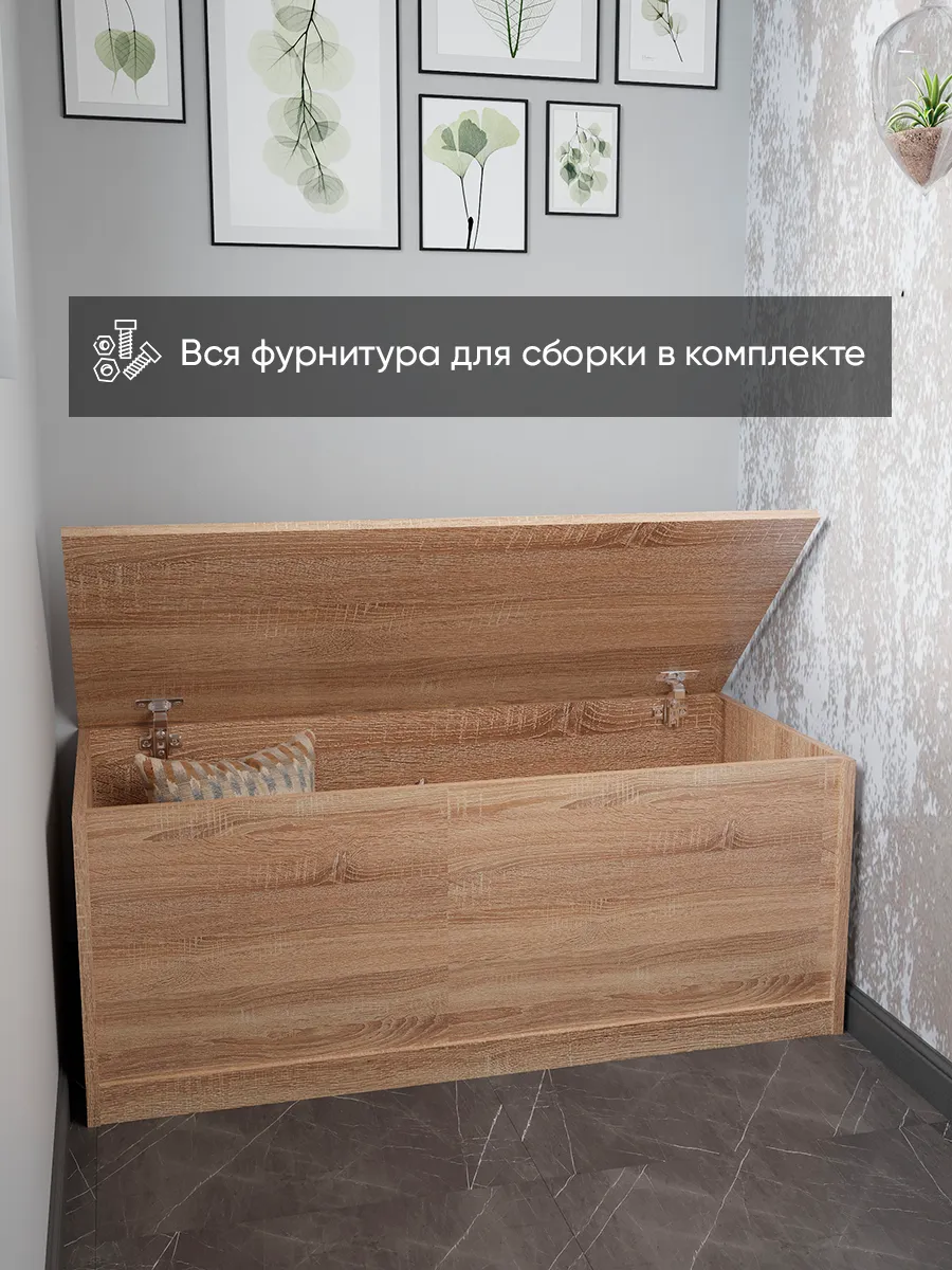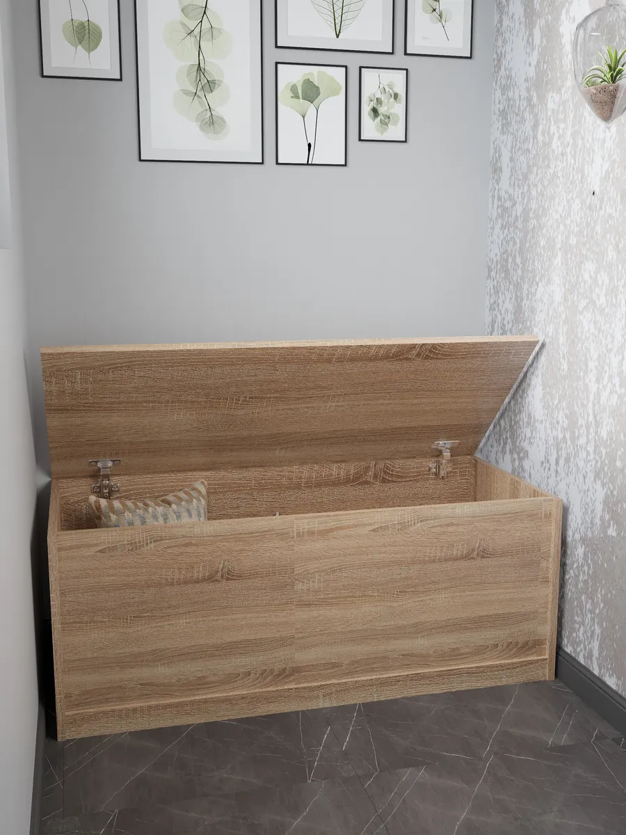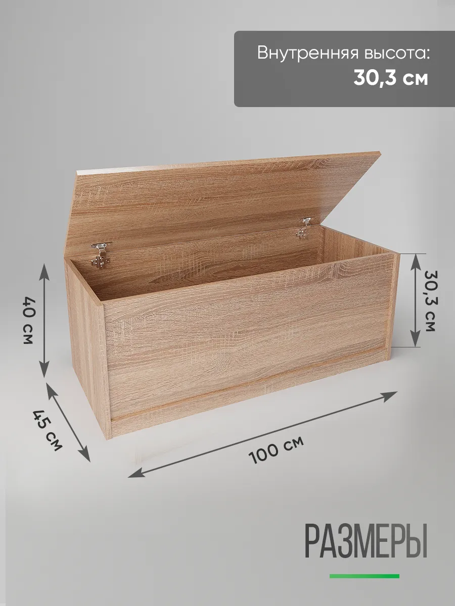 Размеры тумбы ящика с откидной крышкой: ширина 100 см, высота 40 см, глубина 45 см. Доступные цвета: белый, орех, сонома, атланта, венге, дуб золотой, антрацит, дуб катания. Можно положить сверху матрасик и этим сделать напольный диванчик на балкон или в зал, длинную тумбу с сиденьем в прихожую, диванчик для офиса, дачный диван, садовая мебель - своего рода топчан для отдыха в любом помещении.