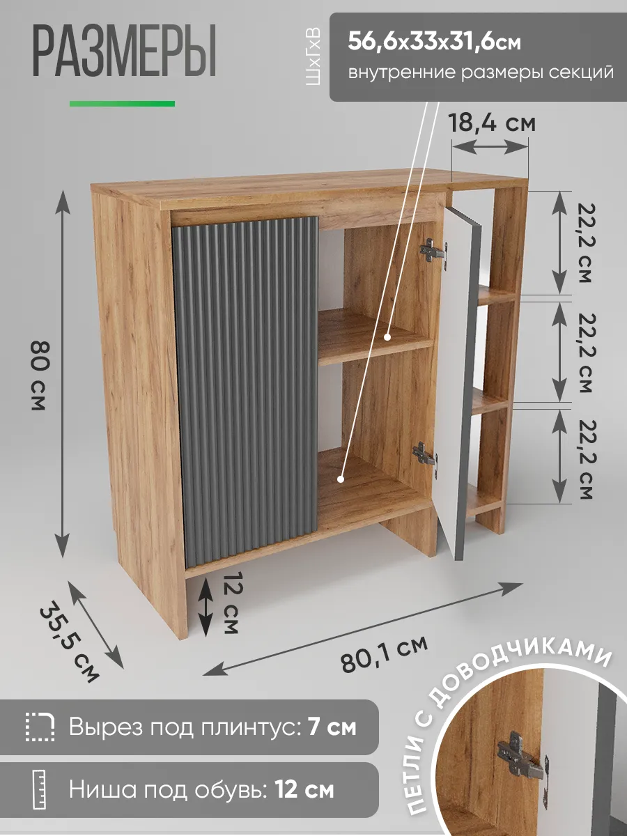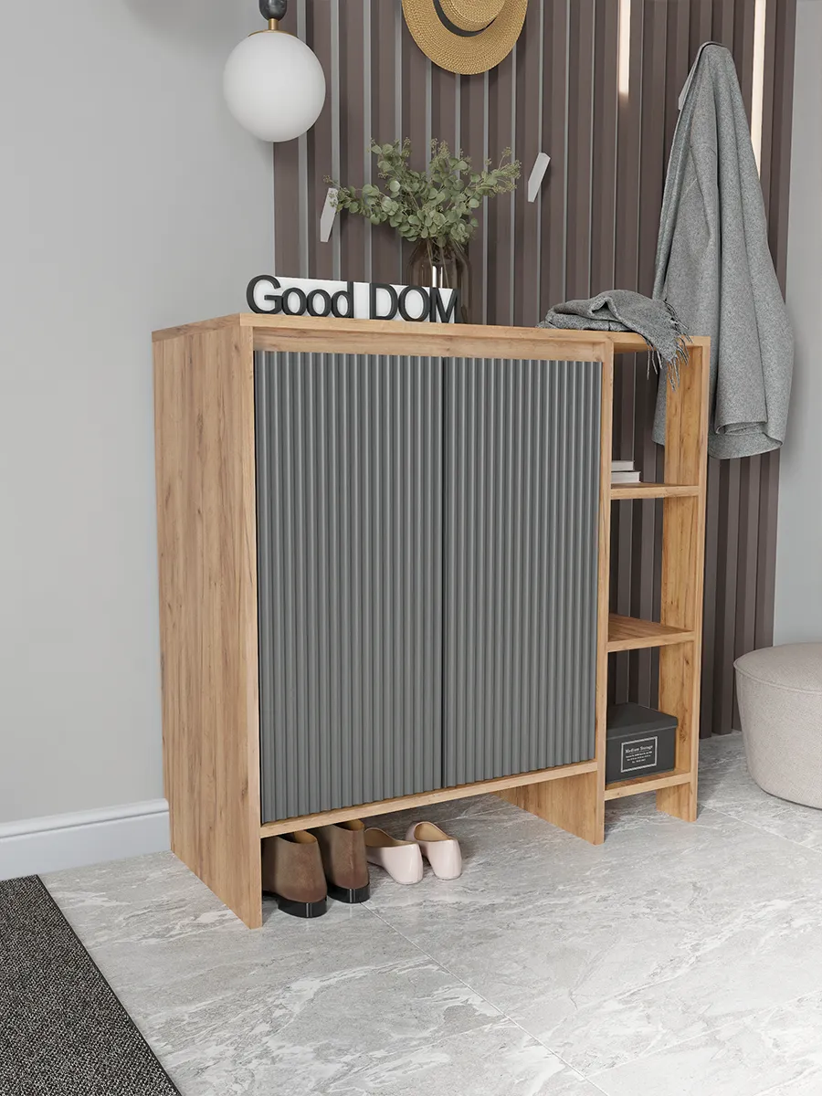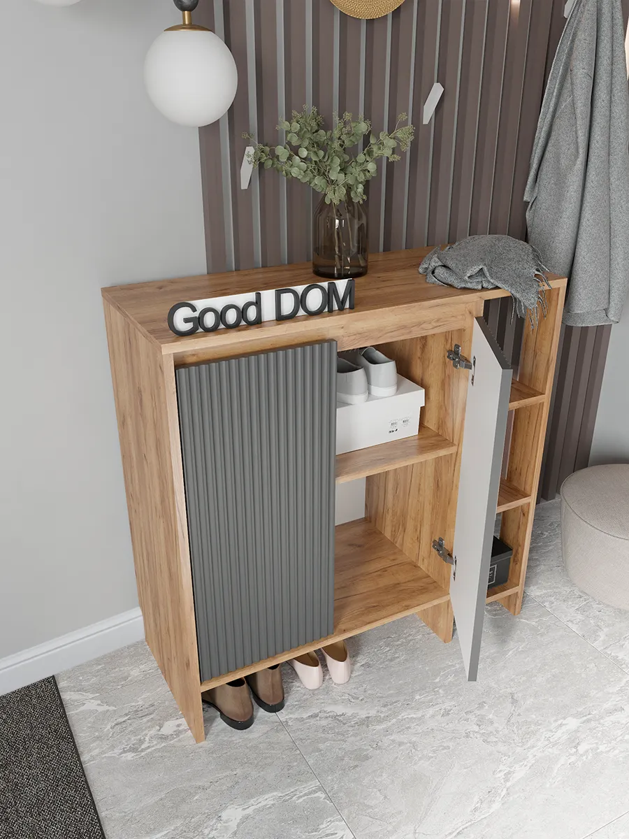 Напольная тумбочка для прихожей сочетает в себе стиль и функциональность. Мебель изготовлена из дерева с графитовым серым оттенком, что гармонично впишется в интерьер в стиле лофт или классическом. Высокий корпус оснащен распашной дверцей, за которой скрыты закрытые секции для хранения одежды, мелочей и ключей. Кроме того, открытая полка и узкий ящик позволяют удобно разместить обувь и другие вещи, необходимые для дома и коридора.