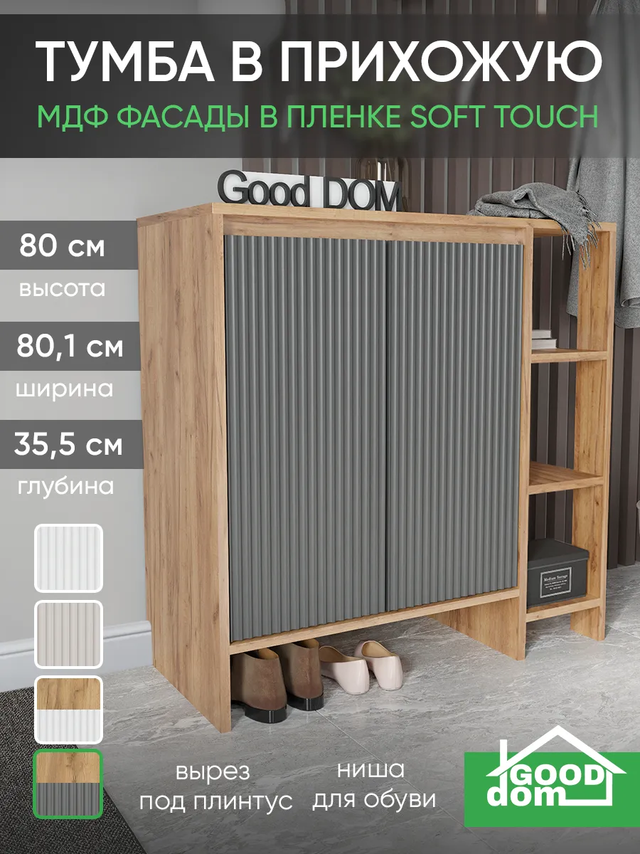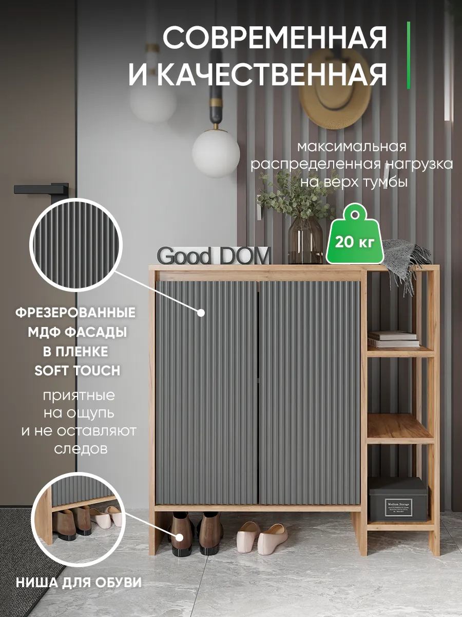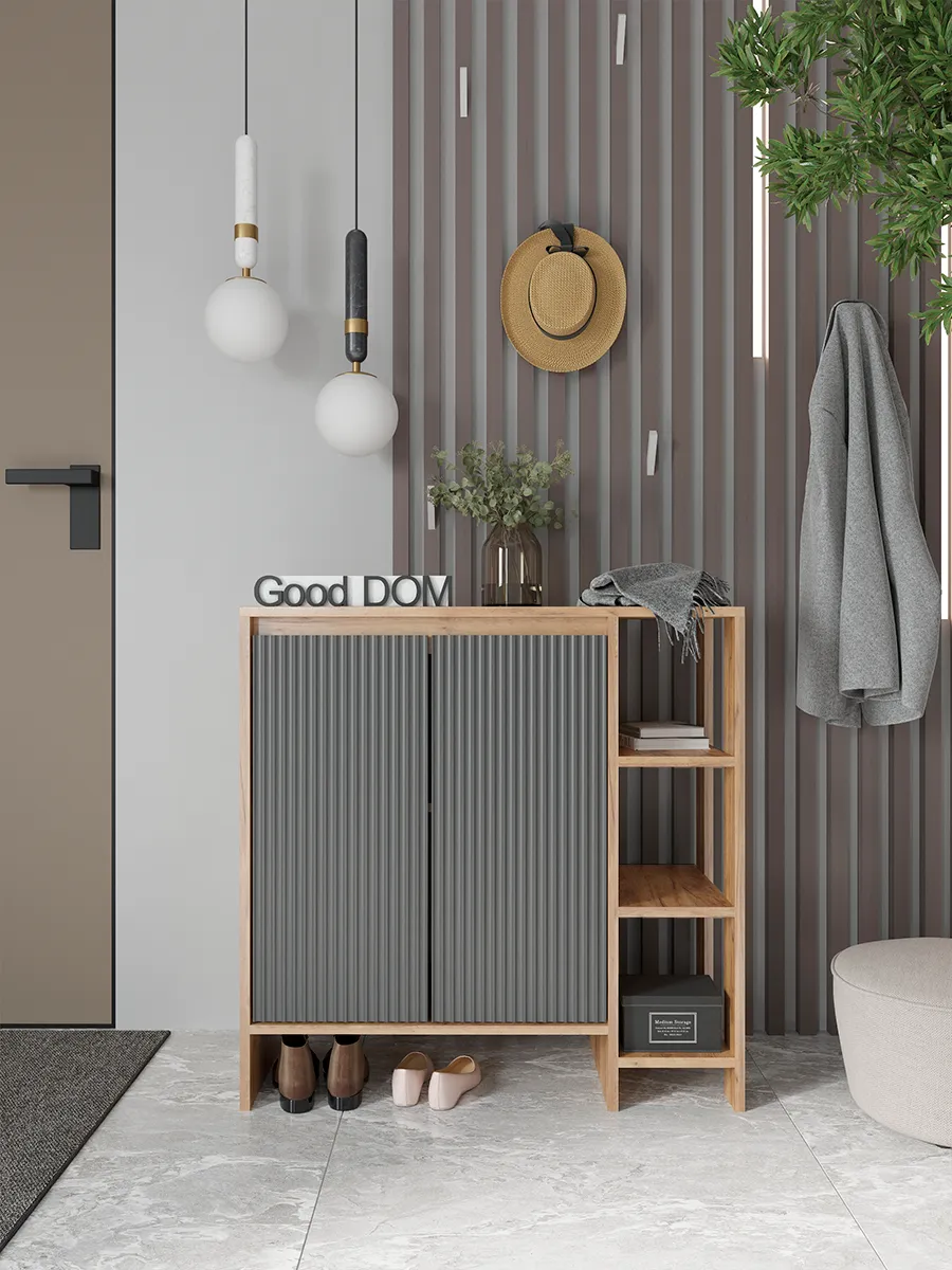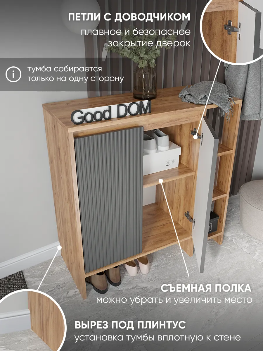 Напольная тумбочка для прихожей сочетает в себе стиль и функциональность. Мебель изготовлена из дерева с графитовым серым оттенком, что гармонично впишется в интерьер в стиле лофт или классическом. Высокий корпус оснащен распашной дверцей, за которой скрыты закрытые секции для хранения одежды, мелочей и ключей. Кроме того, открытая полка и узкий ящик позволяют удобно разместить обувь и другие вещи, необходимые для дома и коридора.