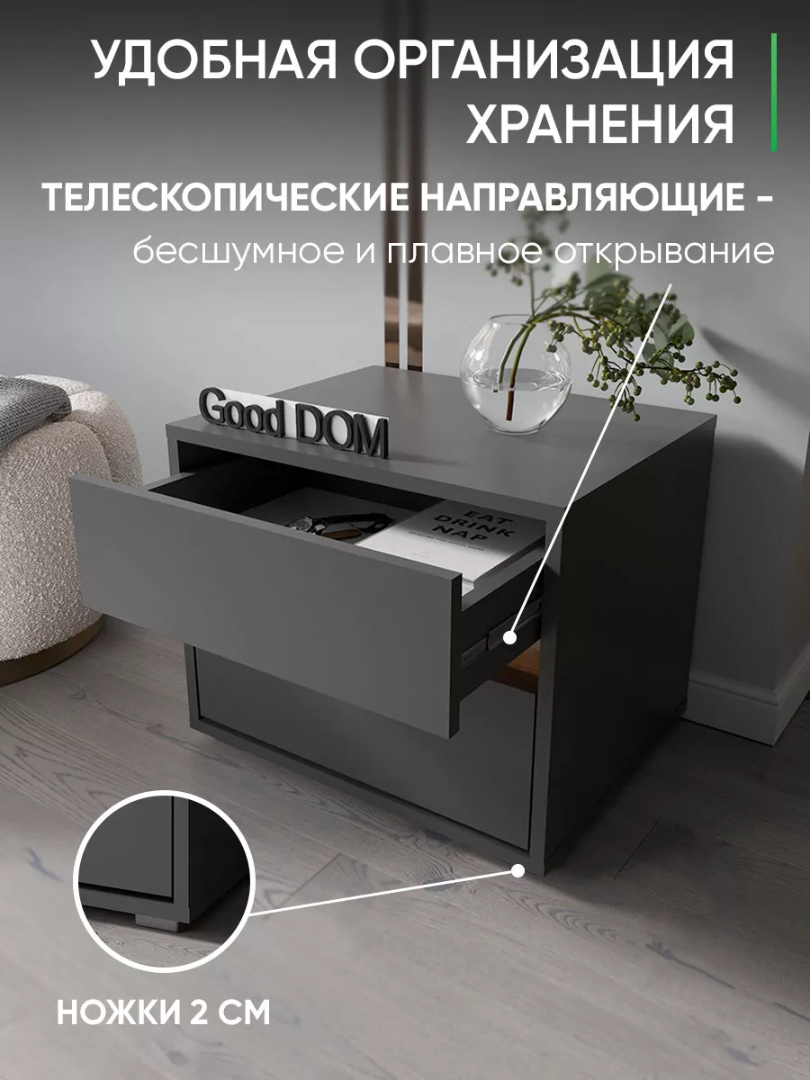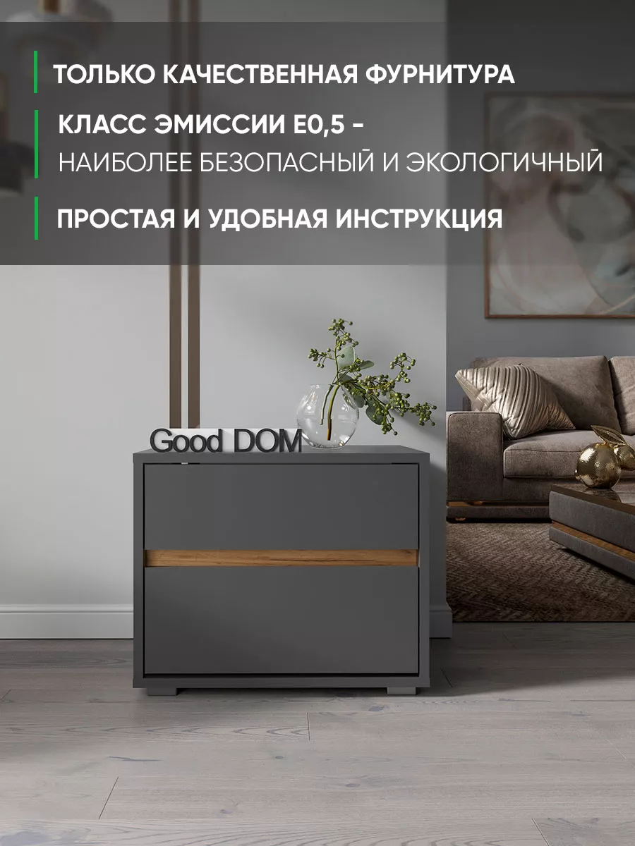 Прикроватная тумбочка изготовлена на новом оборудовании из высококачественных материалов ЛДСП. Мы дорожим качеством и внешним видом нашей продукции, поэтому вся продукция проверяется перед отправкой отделом контроля и упаковывается в коробки с дополнительной твердой защитой. В нашем ассортименте есть много интересных моделей мебели, что позволяет собрать комплект мебели от бренда Good дом, все в Дом, которая сочетается между собой. Чтобы посмотреть всё - просто нажмите на иконку логотипа.