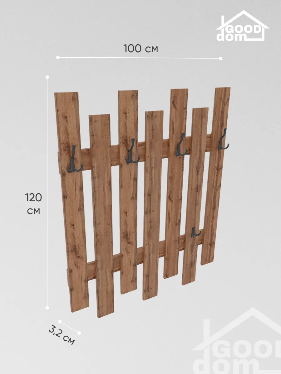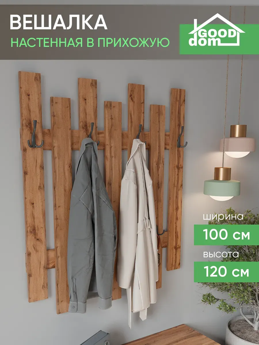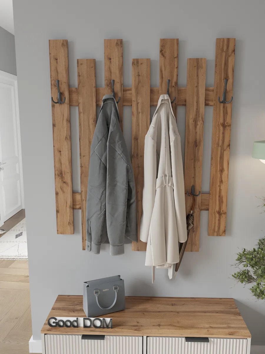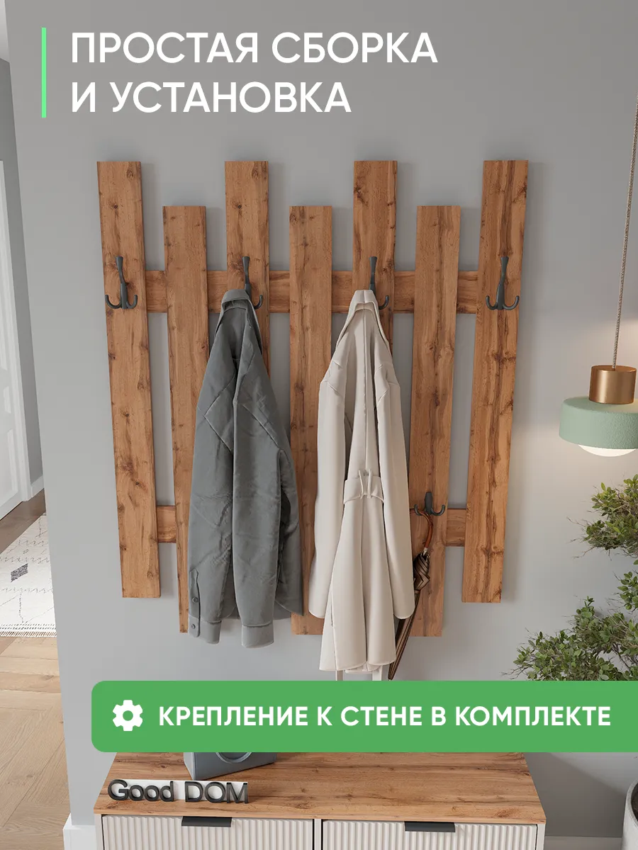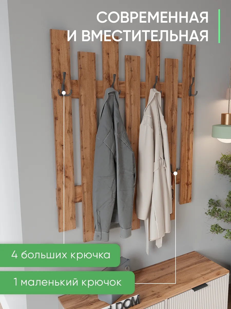 Наша большая вешалка в прихожую для верхней одежды - идеальное решение для входной зоны Вашей квартиры или дома. Настенная вешалка для одежды – эргономичное и стильное решение для прихожей, коридора или дачи. Вешалка для одежды экономит пространство благодаря настенному креплению и позволяет удобно хранить верхнюю одежду, сумки, рюкзаки и аксессуары. Вешалка настенная для хранения верхней одежды из экологических материалов станет органичным решением современного интерьера. Вешалка настенная выполнена из прочной и экологичной ЛДСП, гарантирует долговечность и надежность. Данный материал безопасен для здоровья. Вешалка в прихожую в трендовом цвете дуб вотан устойчива к нагрузкам и легка в уходе. Вешалка деревянная оснащена 5 трехрожковыми крючками для комфортного размещения вещей: четыре больших и один маленький крючок. Вешалка для одежды летом может быть использована для хранения пляжных сумок, а при добавлении держателя – для брюк. Вешалка настенная, имея современный дизайн впишется в любой интерьер. Вешалка с крючками имеет в комплекте всю необходимую фурнитуру для быстрой установки. Вешалки для одежды настенные удобны и функциональны.